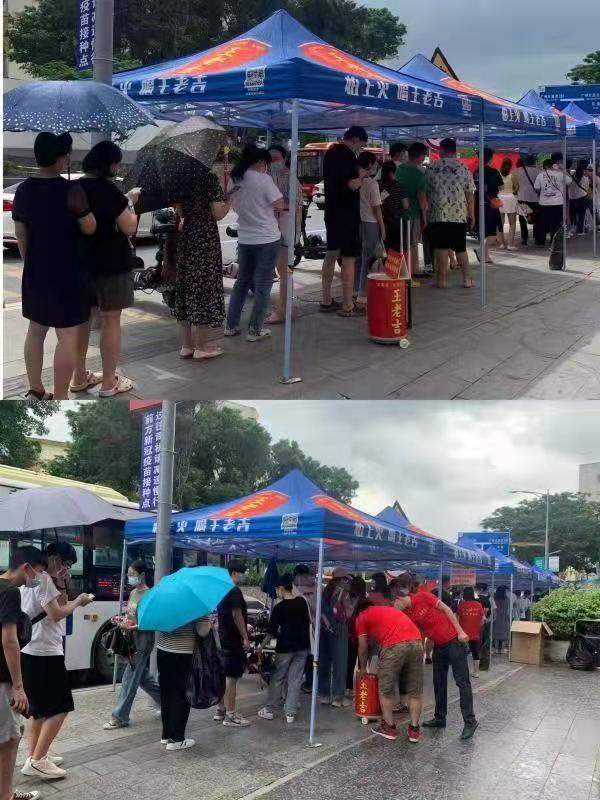 时下广州天气炎热、晴雨不定,烈日与大雨交替。即便身上的衣服被汗水和雨水接连浸湿,现场抗疫防疫的工作人员也没有停下手中的工作,依旧有条不紊地疏导前来接种疫苗的市民,并耐心地为他们指引方向、解答问题。