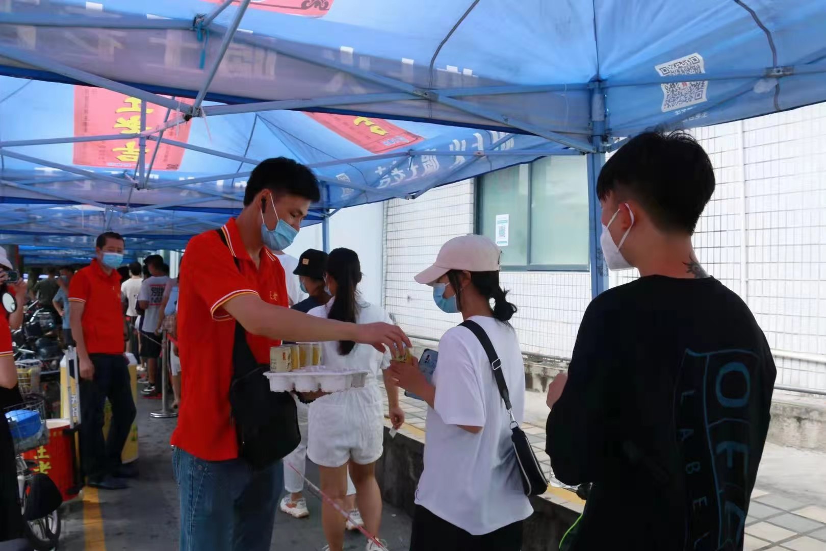 (防疫工作者和排队等候群众收到工作人员派发的刺柠吉)