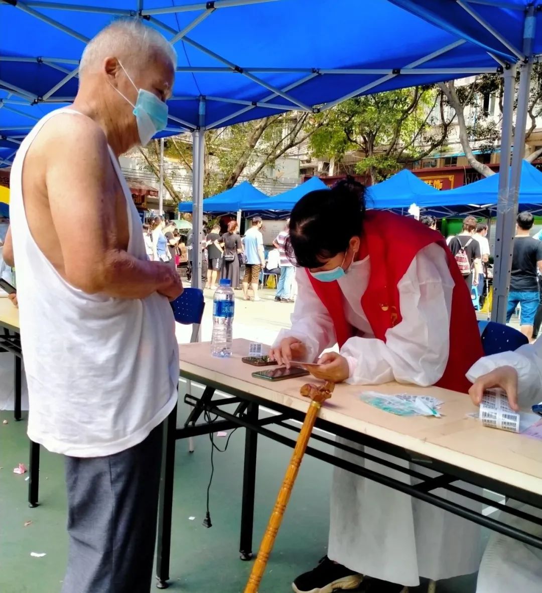 5月30日,供应链第一党支部党员戴丽珍同志来到五羊东社区小广场,作为志愿者为五羊东社区小广场核酸检测点维持秩序,引导群众扫码认证,帮忙确认接种人的签到以及核酸检测情况、出行轨迹等信息,指引群众至有序进行核酸检测,协助社区合力筑牢疫情“防火墙”。