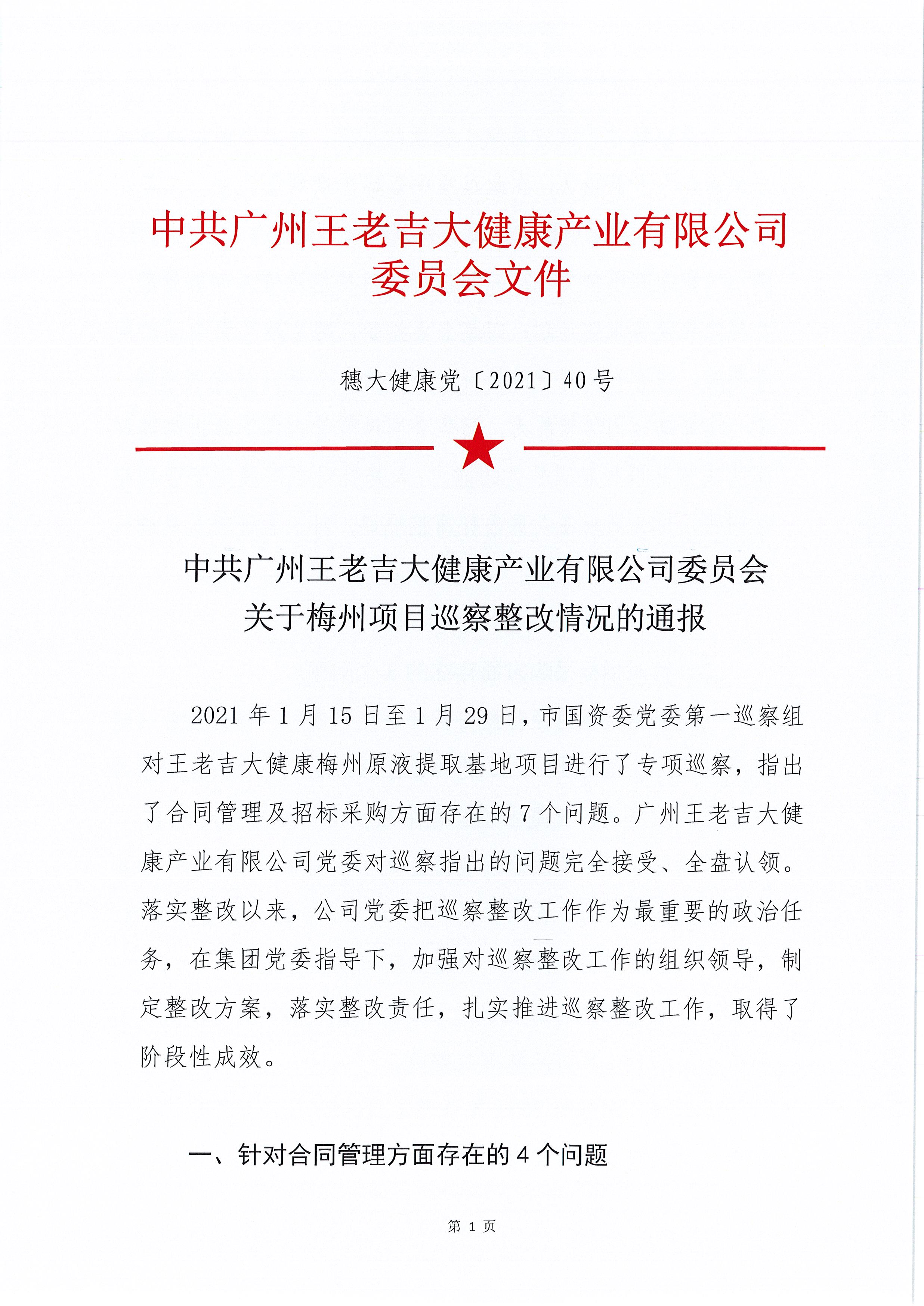 中共广州王老吉大健康产业有限公司委员会关于梅州项目巡察整改情况的通报