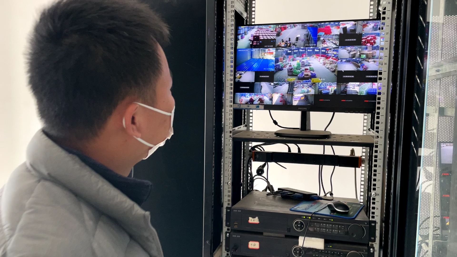 物流调度经理黄春林查看物流中转仓监控。