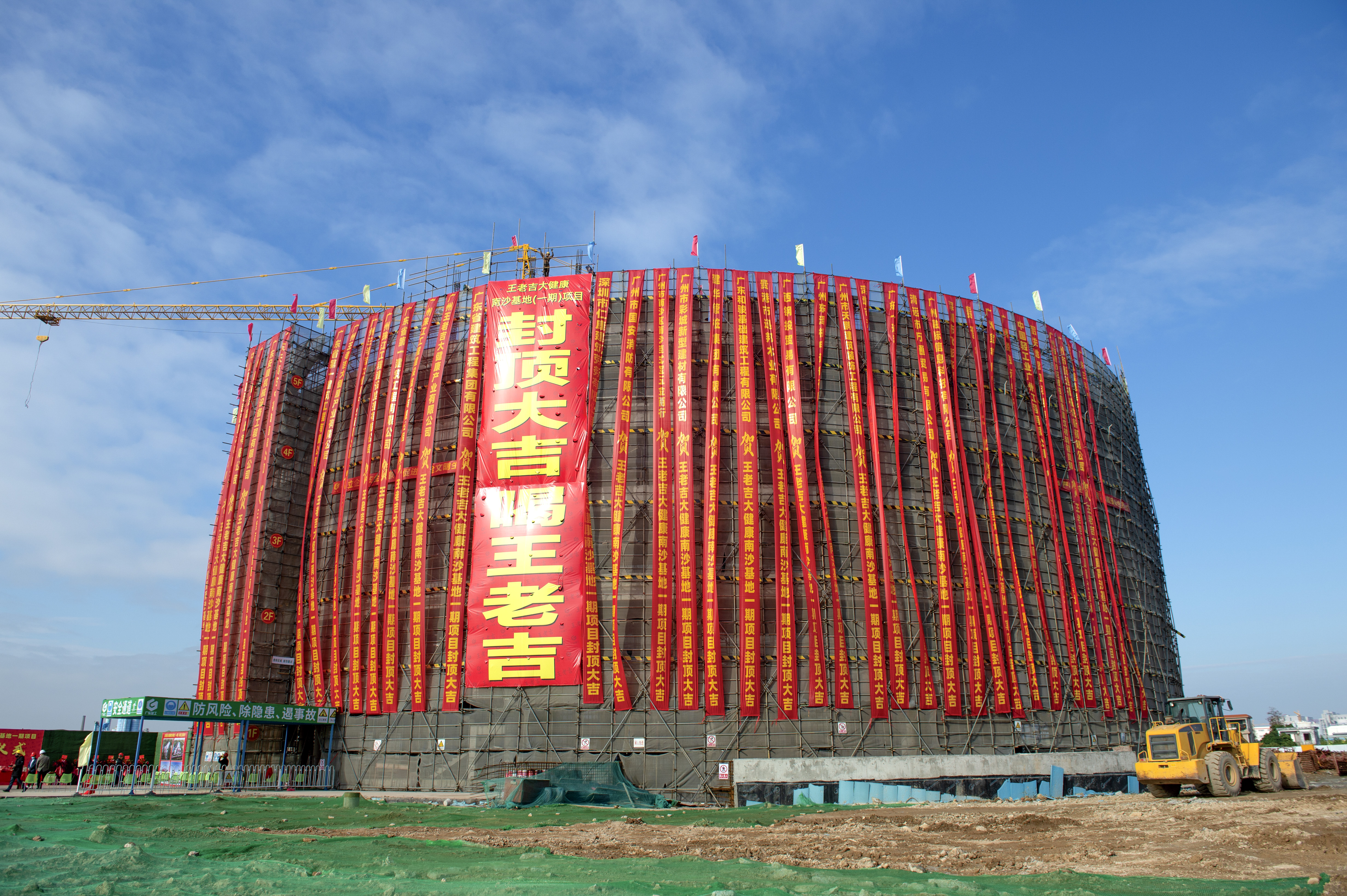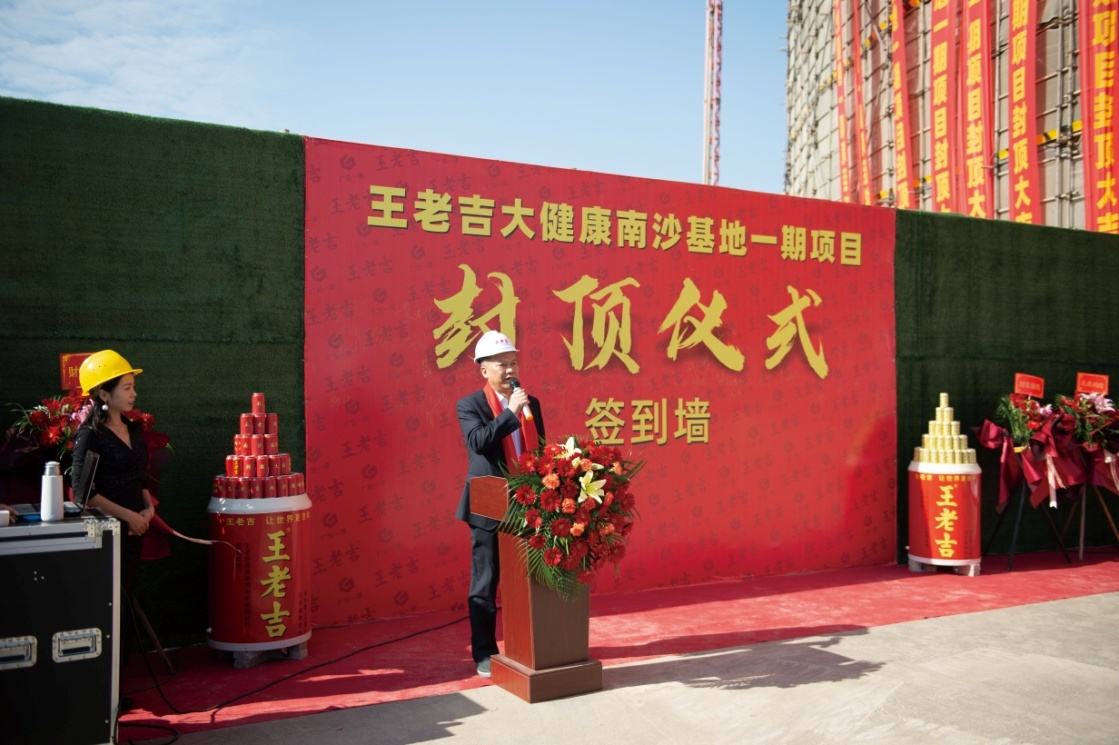 研发大楼上“封顶大吉,喝王老吉”的彩带迎风飘扬