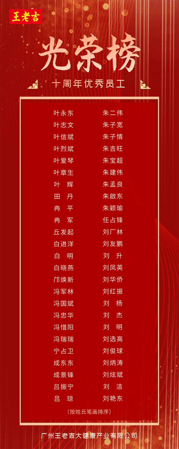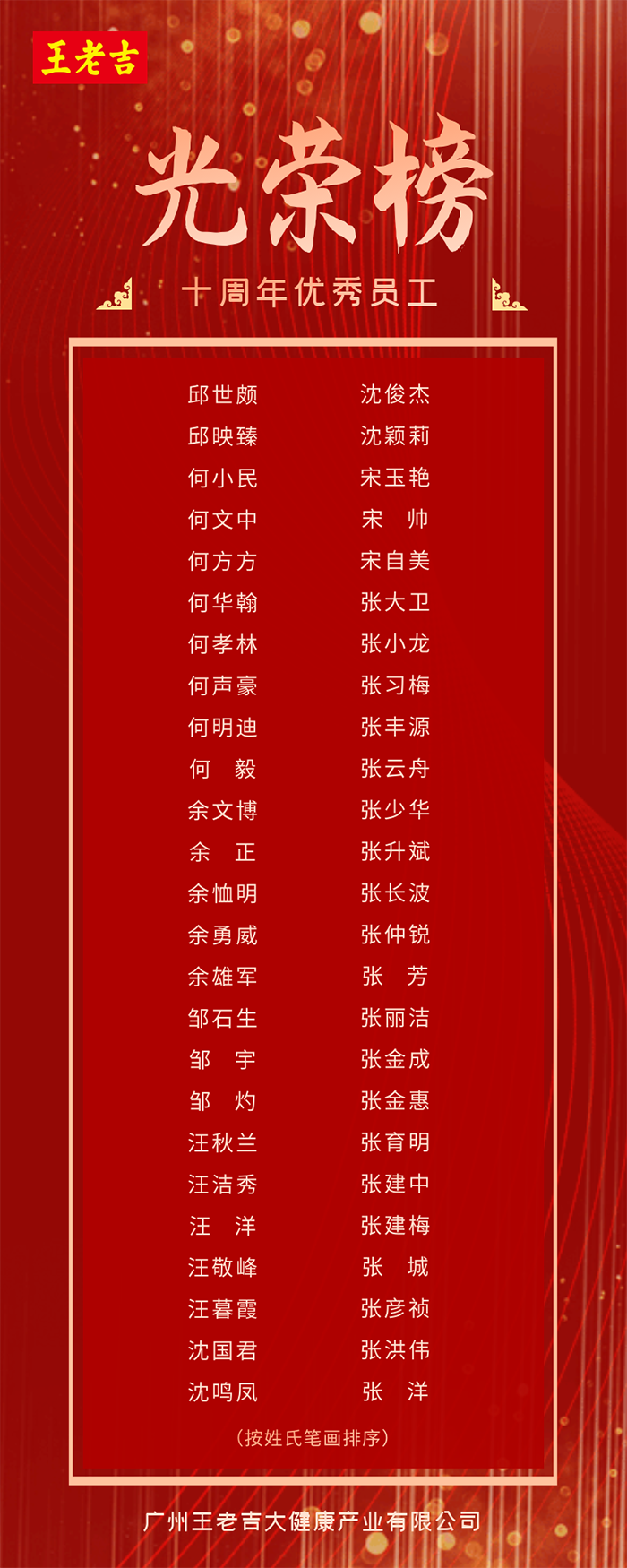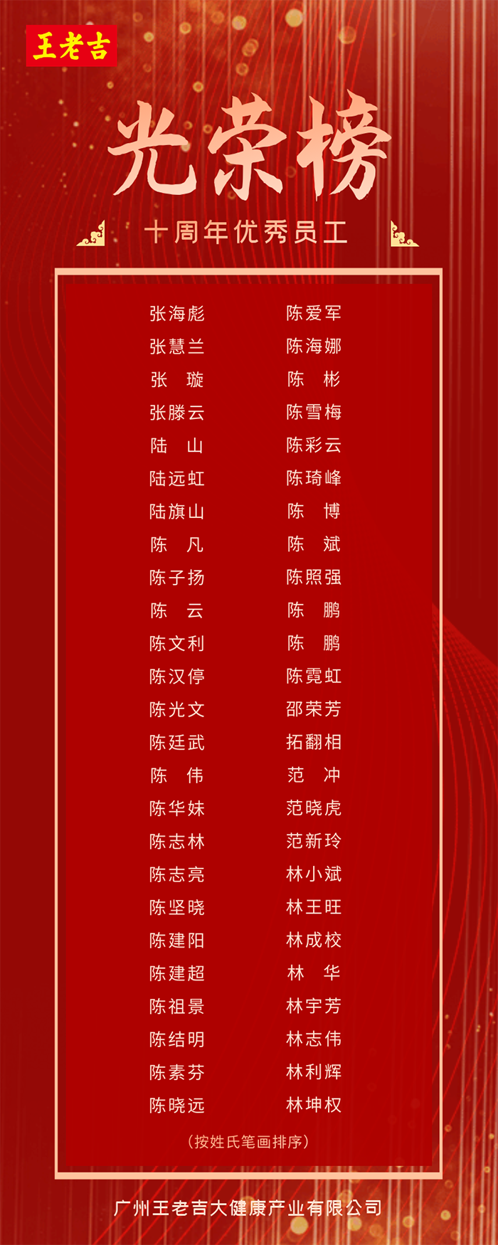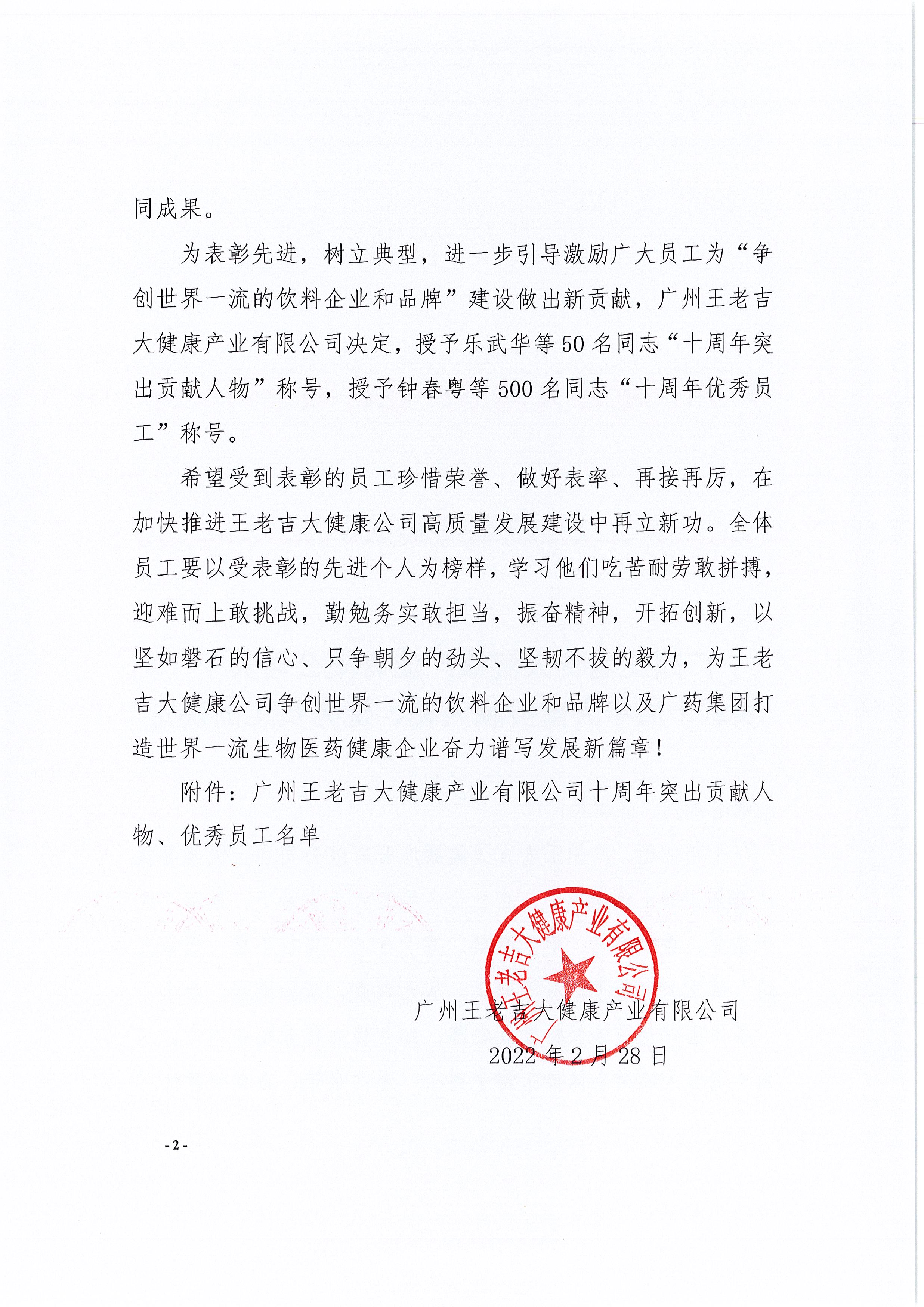 广州王老吉大健康产业有限公司关于表彰十周年突出贡献人物、优秀员工的决定