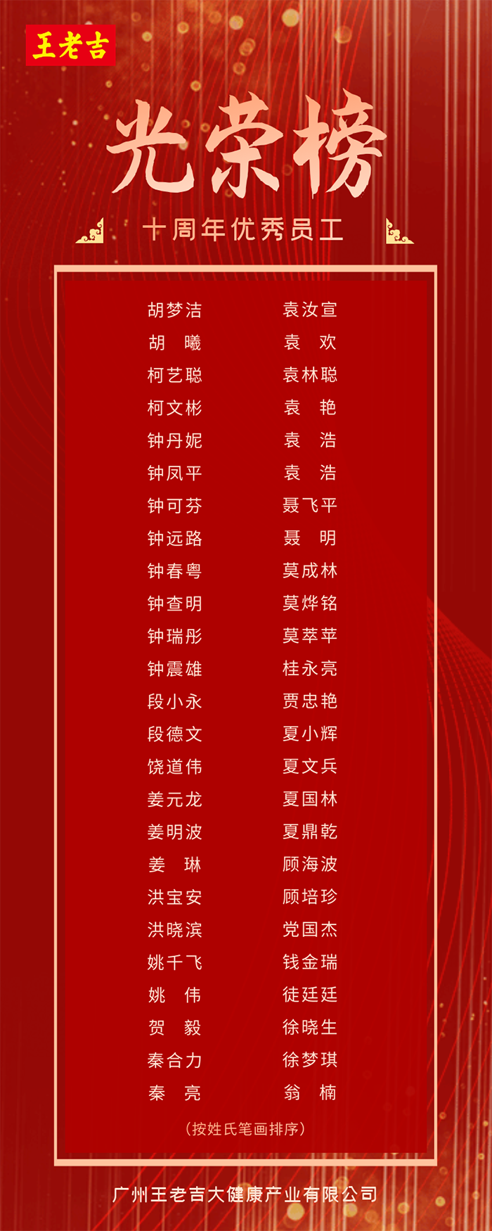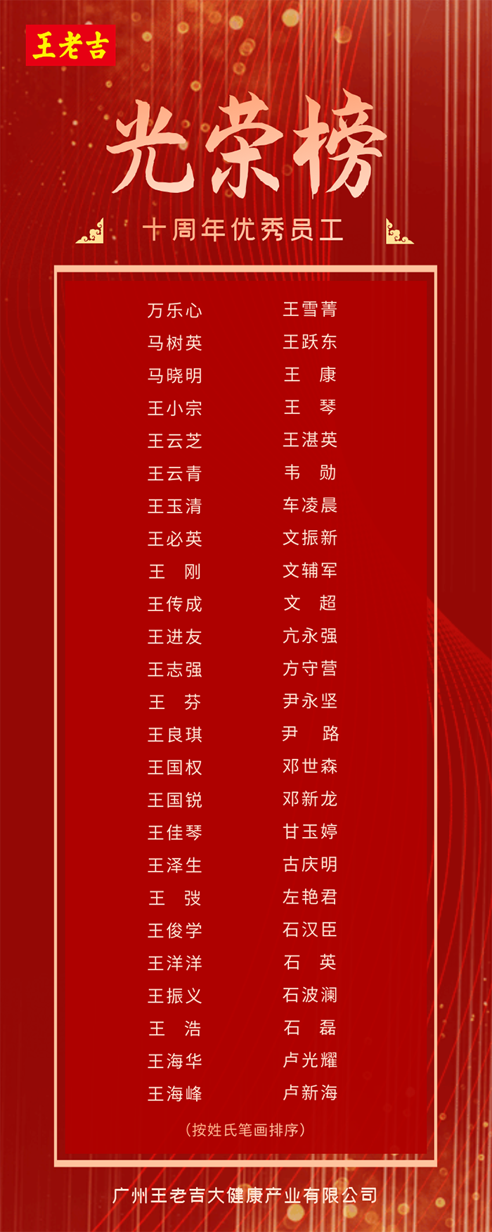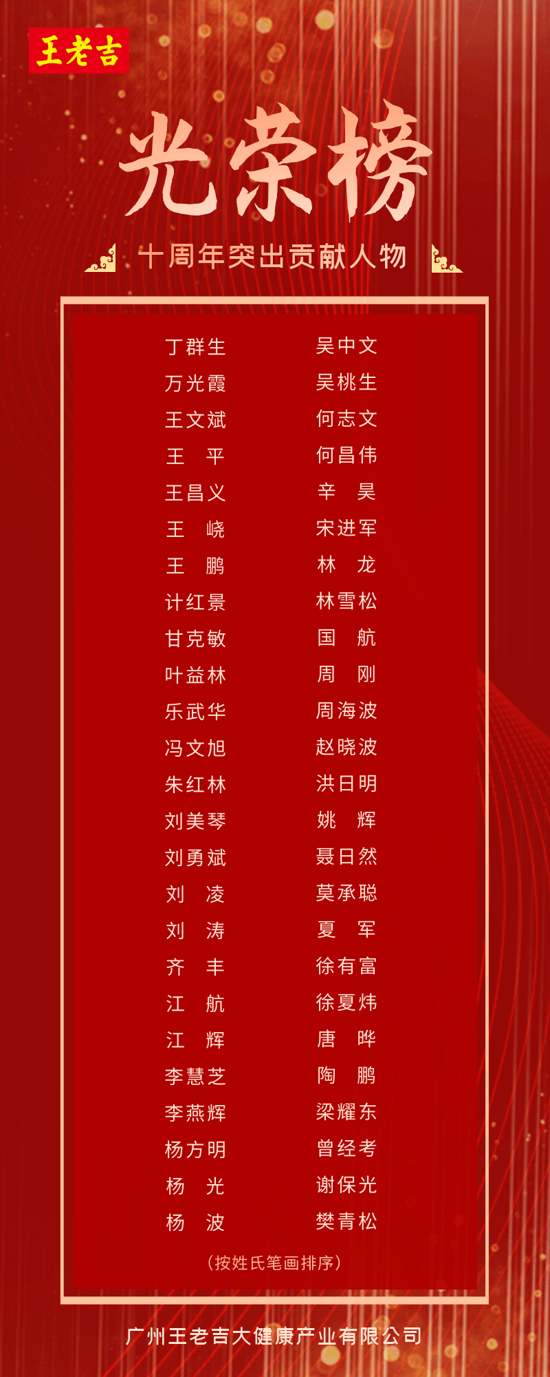 广州王老吉大健康产业有限公司关于表彰十周年突出贡献人物、优秀员工的决定