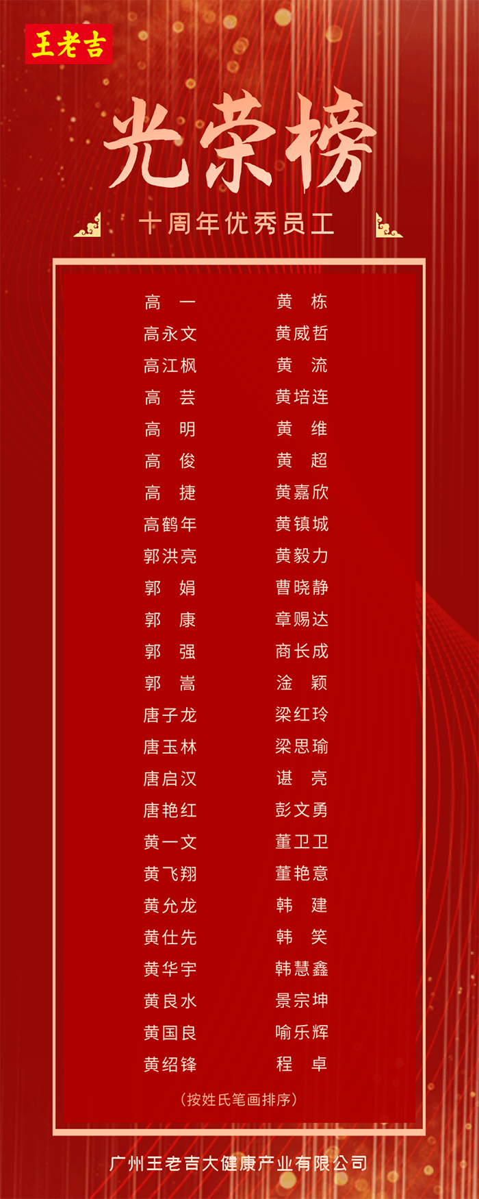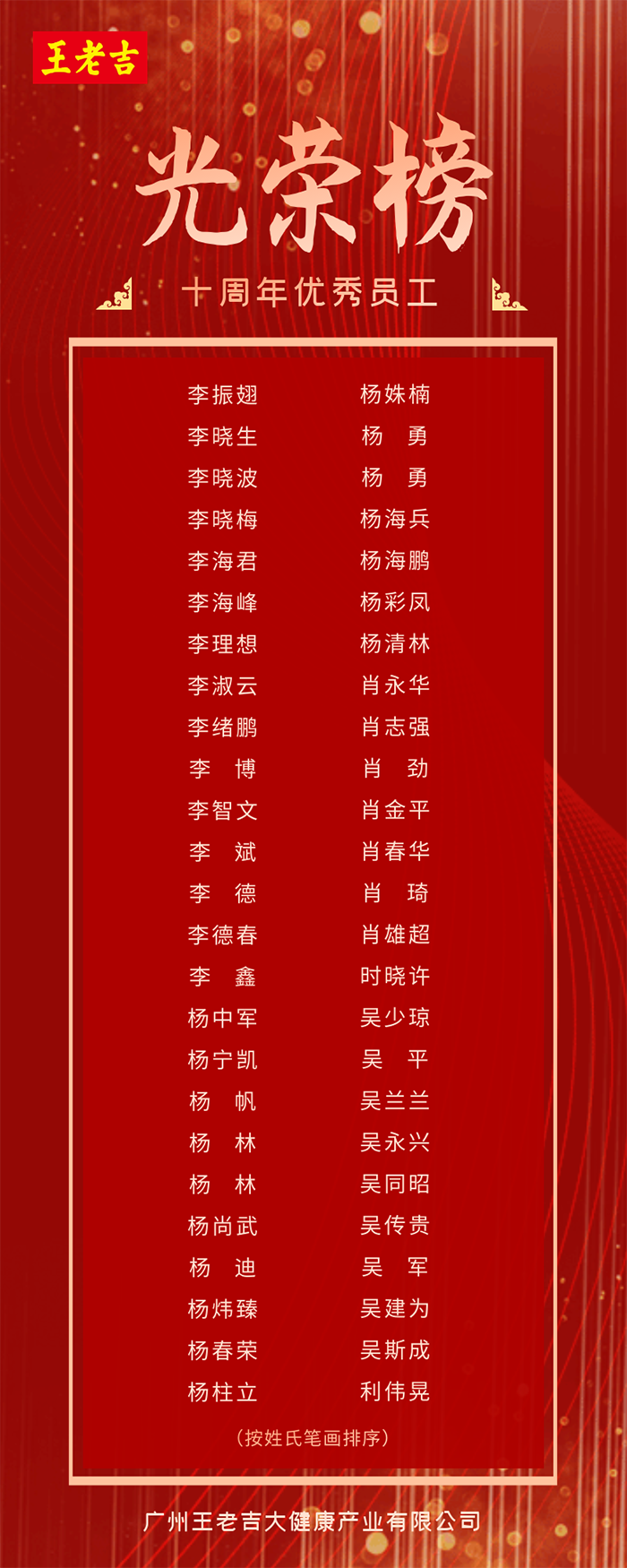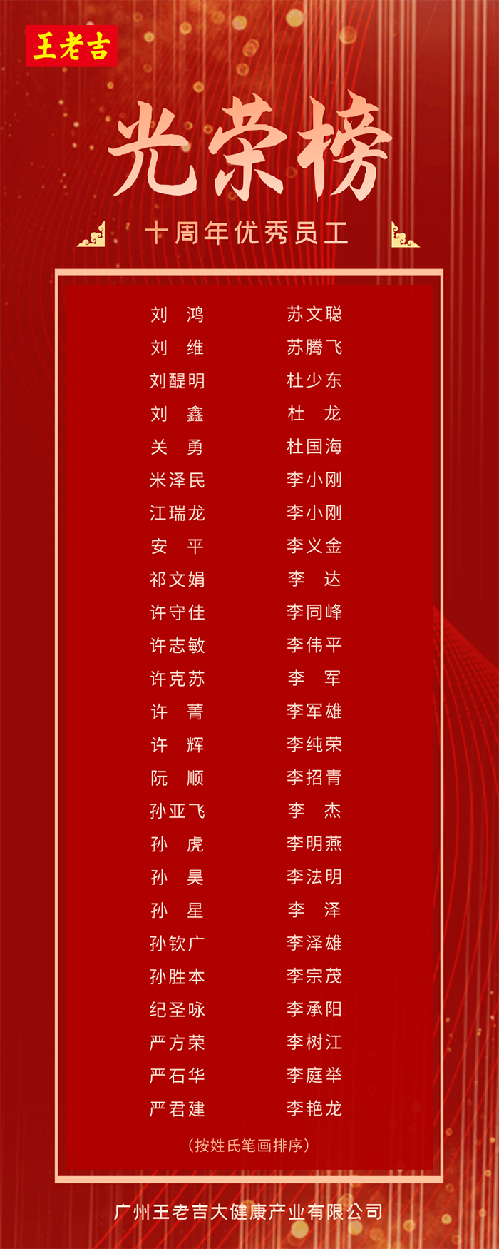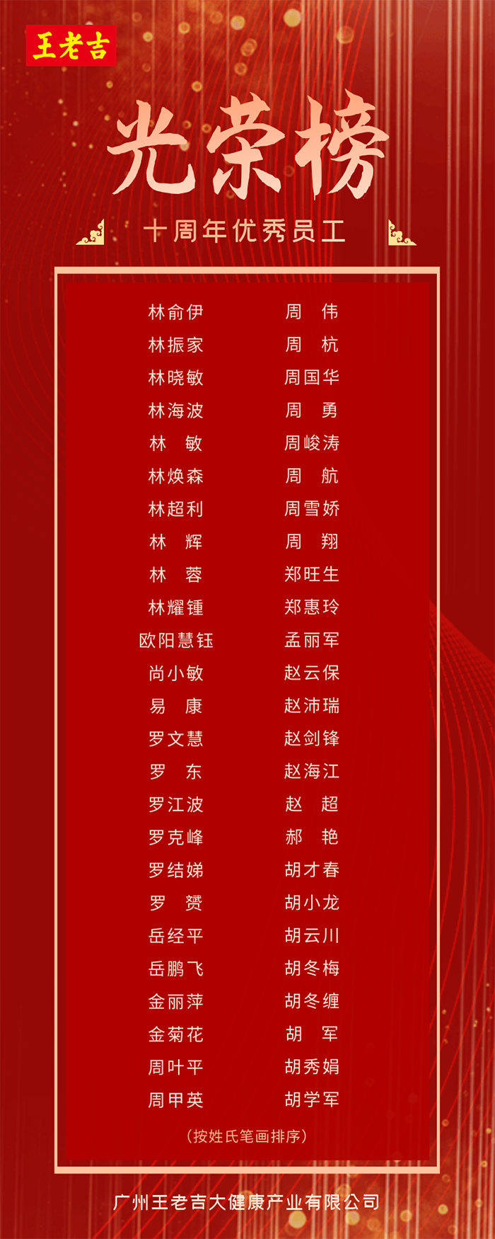 广州王老吉大健康产业有限公司关于表彰十周年突出贡献人物、优秀员工的决定