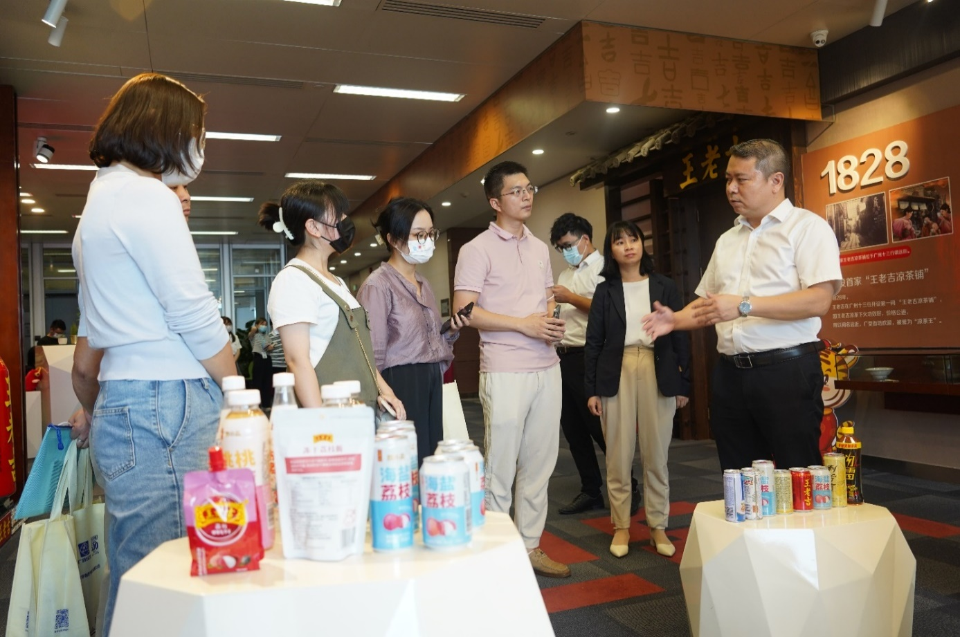 首先,白云山化学制药厂来访一行参观了王老吉大健康公司总部的品牌展厅,了解了王老吉品牌的发展历程;在参观现场产品陈列期间,杨宁凯向化学药厂同事们介绍了王老吉大健康凉茶系列产品及非凉茶系列产品,还有广药王老吉两大助力乡村振兴的产业系列产品——刺柠吉和荔小吉。