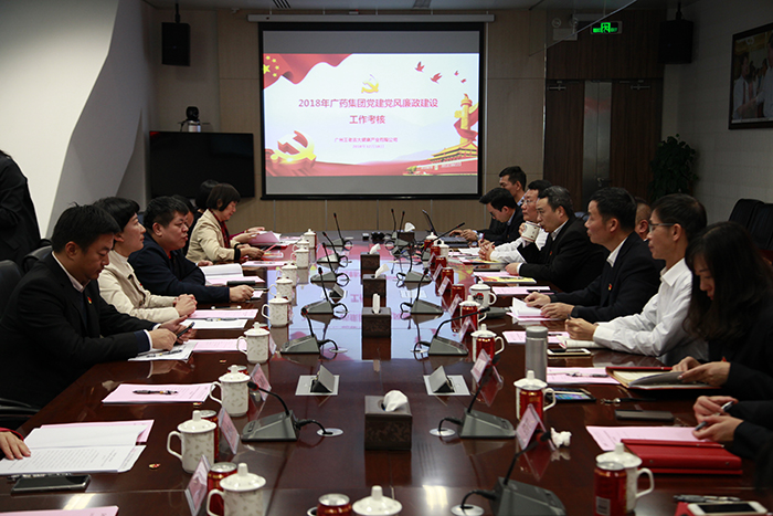 12月18日下午,广药集团党建党风廉政建设考核第二小组(以下简称考核组)在组长、广药集团纪检监察室主任程金元率领下对我司2018年党建党风廉政建设工作情况进行现场考核。公司领导班子、党委委员、纪委委员及中层代表与职工代表出席会议。