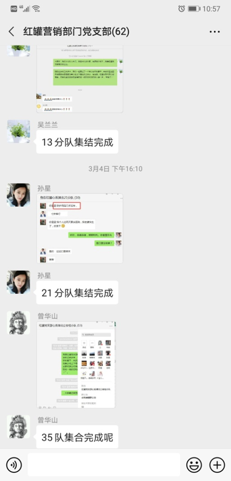 “13分队集结完毕!”,“21分队集结完成!”,“35队集合完毕啦!”…..3月4日,红罐营销部门党支部微信群里炸开了锅,在支部书记李慧芝同志的统筹安排下,支部党员对身处疫区的湖北职工进行“一对多”的结对帮扶,每一名红罐党员负责10位湖北员工的联系工作,不到一天时间,58个帮扶小分队全部集结完毕,纷纷在支部群里向党组织汇报一线情况。每一支帮扶小分队的组建,犹如一只只看不见的手,把身处湖北疫区的同胞们紧紧地攥在一起,各位湖北的兄弟姐妹们,你们辛苦了!你们不是独自在承受,在战斗,有什么需求帮助,请跟我们说!