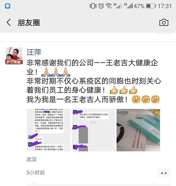 此次帮扶行动中,支部党员还意外地挖掘出不少令人感动的事迹, 平时他们是可爱的王老吉人,如今化身为一群“深藏功与名”的志愿者:来自武汉江南餐饮组的李俊,从疫情一爆发就默默无闻地奋战在医疗物资运输一线,由于他本人处事低调并没有将志愿事迹上报公司,若非同事“爆料”,大家还不知道他已冲锋陷阵多时,时至发稿,李俊仍在一线忙碌来不及和支部细聊,只愿疫情能早日退散,英雄平安凯旋;有社区志愿者江北站徐涛、咸宁办郭恺、KA组余华亮,在疫情严峻大家都不敢出门的时候,他们主动扛起了为社区居民采购和分配生活物资的重任,并配合街道担任防疫监督人员;还有担任街道防控巡逻兵的恩施办贺镭,日常协助交警公安部门对路口的车辆人员进行登记排查,并负责每日5公里的街道巡逻任务;有的员工即使隔离在家,仍心系市场,担心疫情期间积压下来的库存,复工激情高涨;有的即使身处疫区,在支部提供无偿口罩的时候婉言谢绝,声称要把物资留给更有需要的同胞。