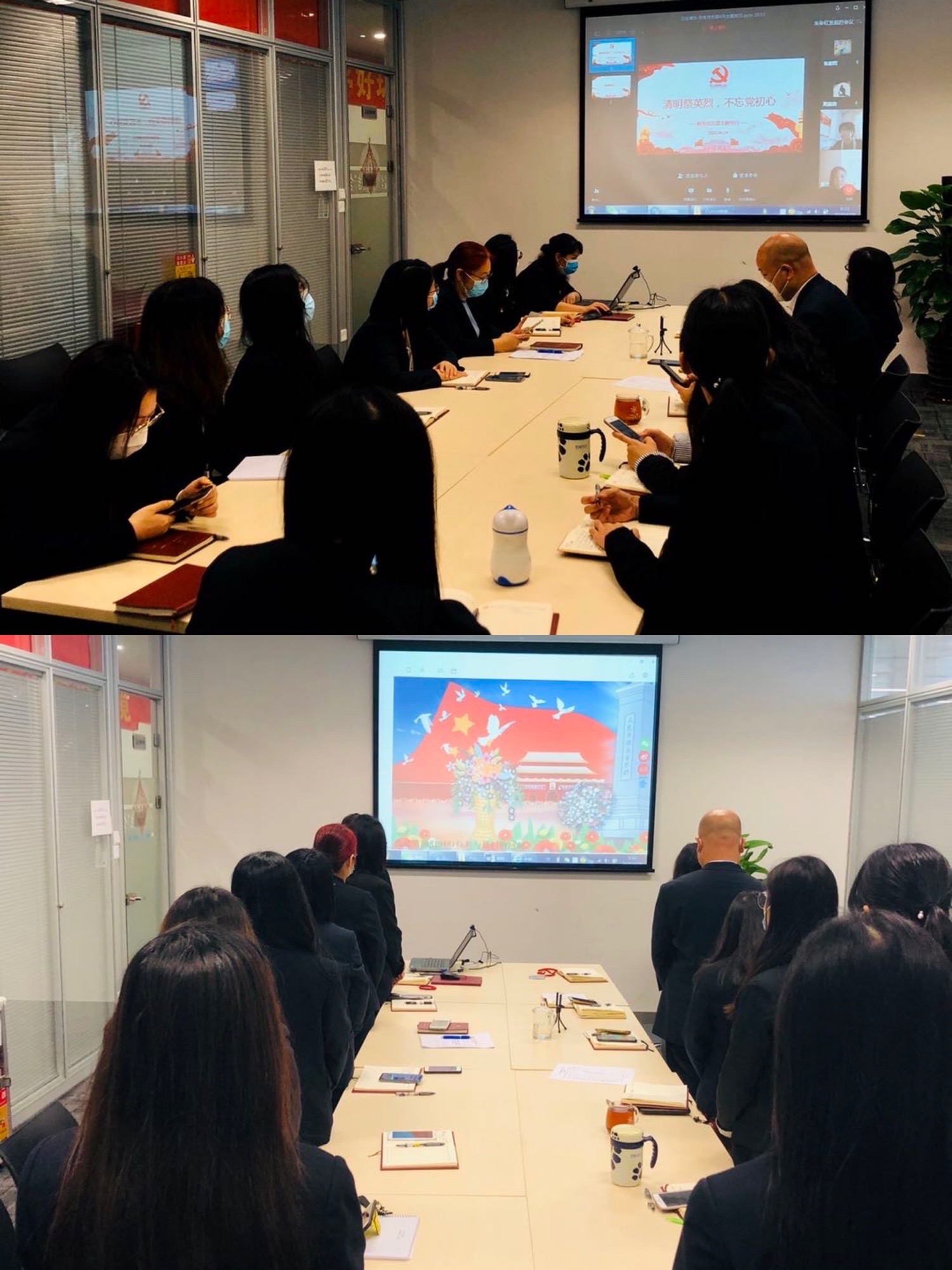 在线祭扫后,全体党员集中观看了系列央视微视频《让党旗在疫情防控斗争第一线高高飘扬》,我们看到,在没有硝烟的战场上,一名名共产党员挺身而出,一句句口号响彻心扉,“疫情就是命令,防控就是责任”、“全力以赴,尽锐出战”、“中国加油、武汉加油”,一个个战斗堡垒巍然矗立,鲜红的党旗在疫情防控一线高高飘扬。每个视频都让大家感动,广大医护人员冲锋在前,他们逆风而行、一往无前、不胜不归的信念,让我们明白,眼下的岁月静好,是有人替我们负重前行。会上甘克敏书记指出,疫情下,我们每一位党员都要以身作则,尽好党员义务,做自己力所能及的事,做好宣传引导工作,做好自我防控;工作上,每一位财务人都要“守初心,担使命”,在财务岗守好土尽好责,做财务人应该做的事。