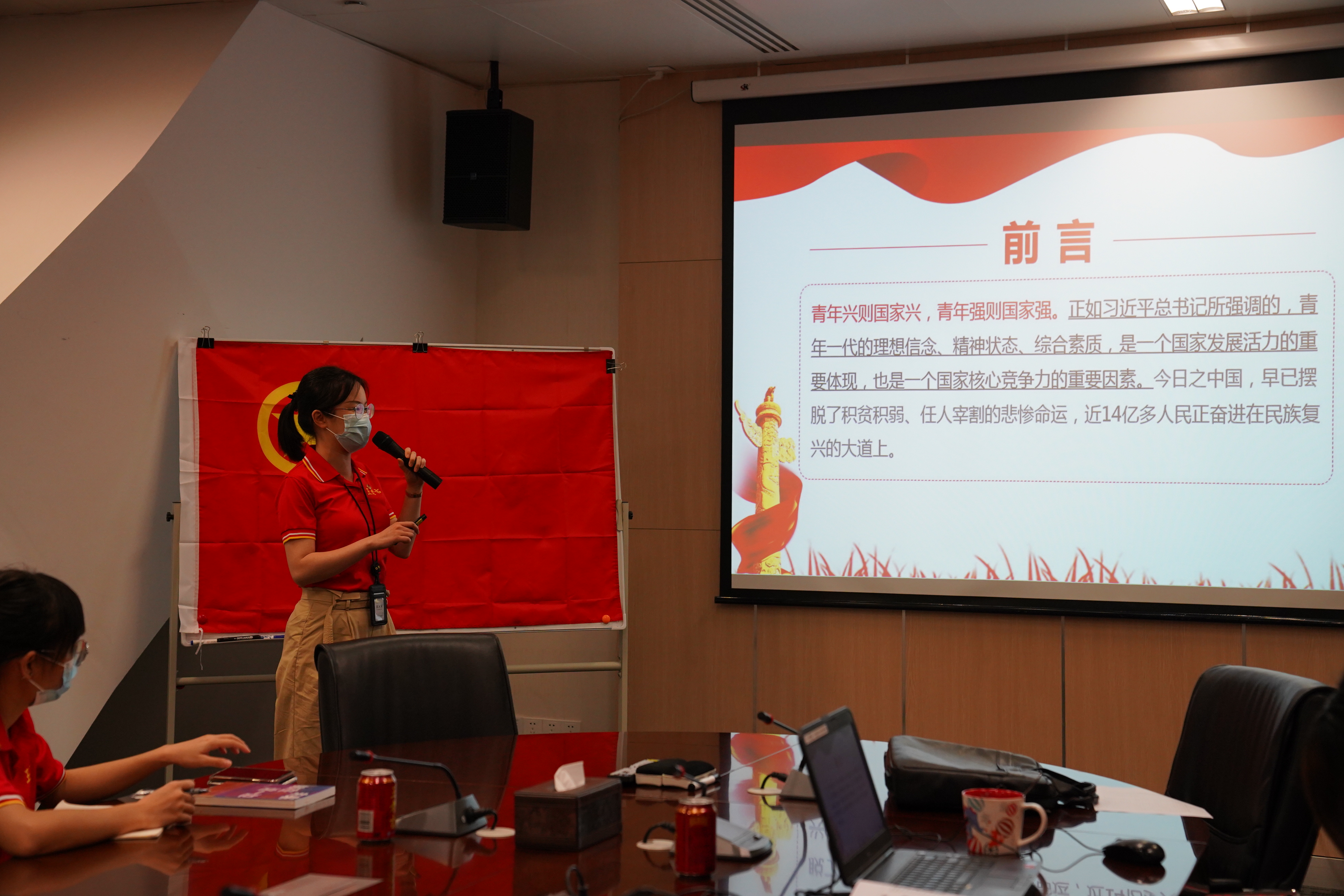 王老吉大健康公司团委委员王雨菲为团员们做《绽放战疫青春、坚定制度自信》的主题团课分享