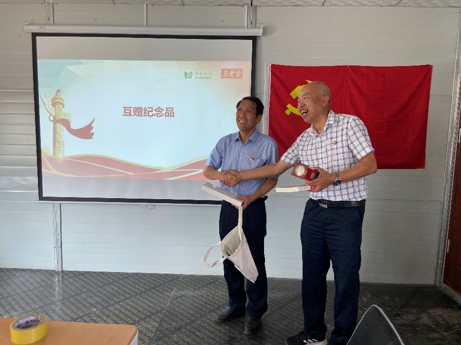 为在今后更好地相互宣传对方企业,直管党支部准备了王老吉书籍《中国红》和王老吉纪念罐,中牧股份临时党支部准备了企业介绍册子和宣传品,投资基建中心副总监刘厂林和中牧股份副厂长王文智代表互赠纪念品,希望从此结下更深厚的共建关系。