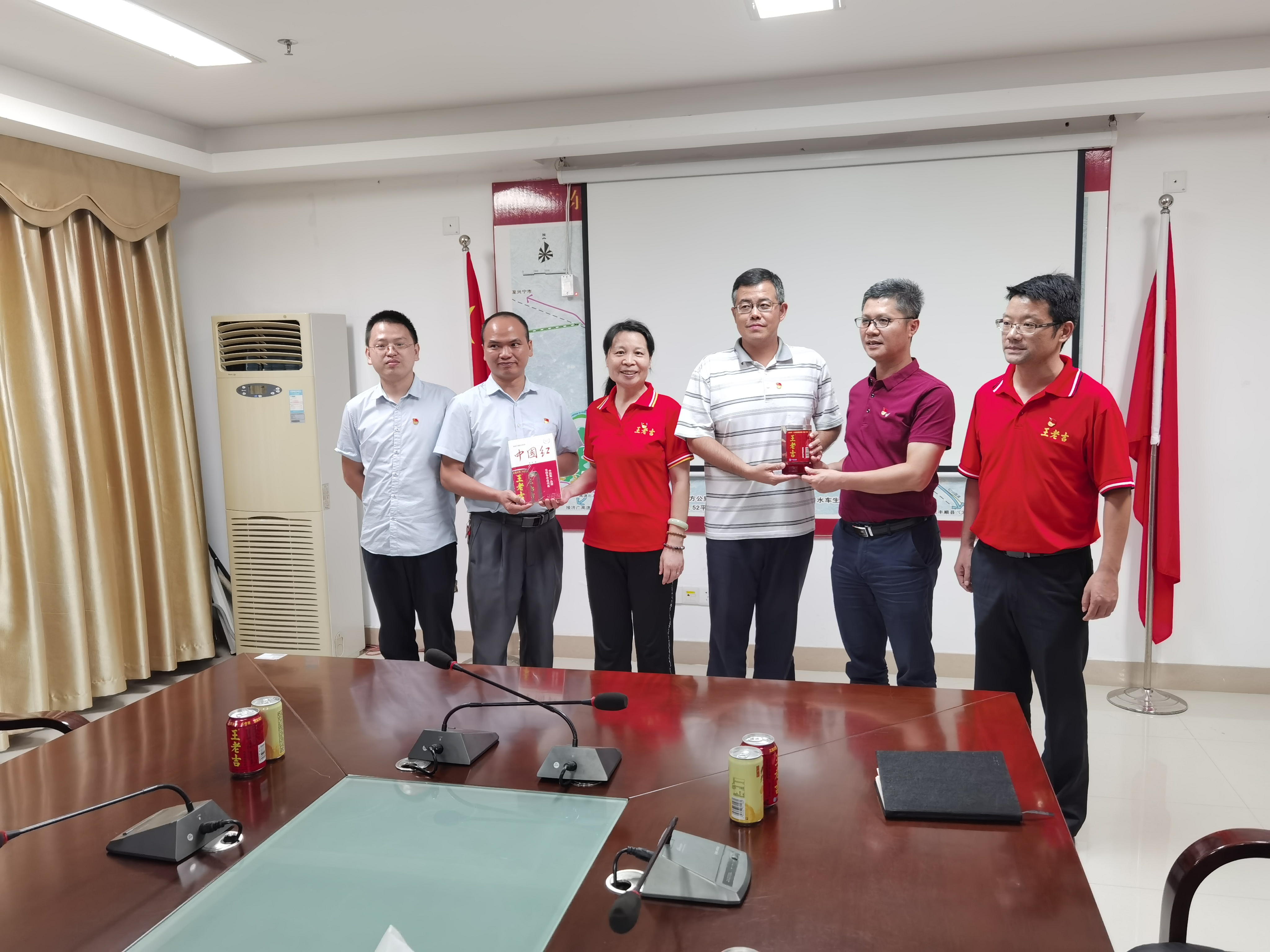会上大家共同学习了习近平总书记在打好精准脱贫攻坚战座谈会上的讲话,不管是园区管委会,还是园区在建企业,大家都在以实际行动践行习总书记的讲话精神,并将一以贯之将产业扶贫工作进行到底。纪委书记蔡涛同志介绍了公司的党建以及公司品牌文化,同时表示公司党委坚持以习近平新时代中国特色社会主义思想为指导,认真学习贯彻党的十九大精神,扎实推进党建各项工作,为大健康公司的经济发展提供了强有力的政治保障。直管党支部书记刘美琴同志表示通过党建活动,我们提高了党员的先进性;而这种先进性带到实际的建设项目中去,同时也带动了非党员员工,为项目建设顺利试产提供了保障。梅州党支部杨方明同志表示梅州公司的技术骨干全部是党员,通过党建提高了团队凝聚力,未来将全力以赴为梅州公司生产发展做贡献。管委会副主任管在贤对王老吉落户产业园并积极推动项目建设表示感谢,同时表示会积极支持王老吉梅州的竣工试产和生产,并尽一切可能做好服务。会上对梅州项目即将投产存在的问题进行了讨论,后续将继续跟进并落实解决。最后向园区的建公局党支部赠送了公司的纪念罐和《中国红》。