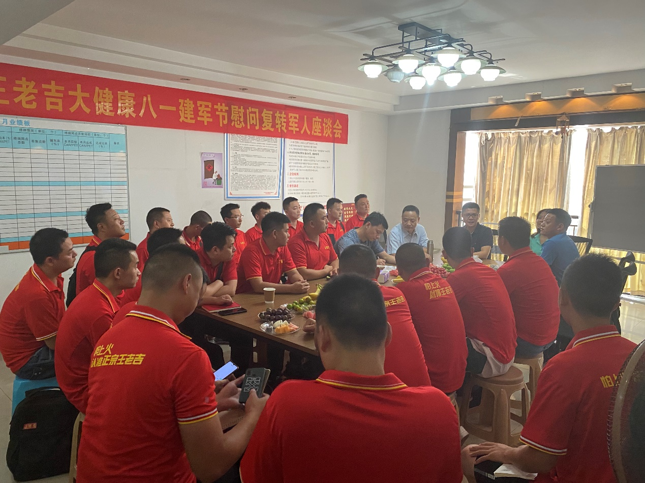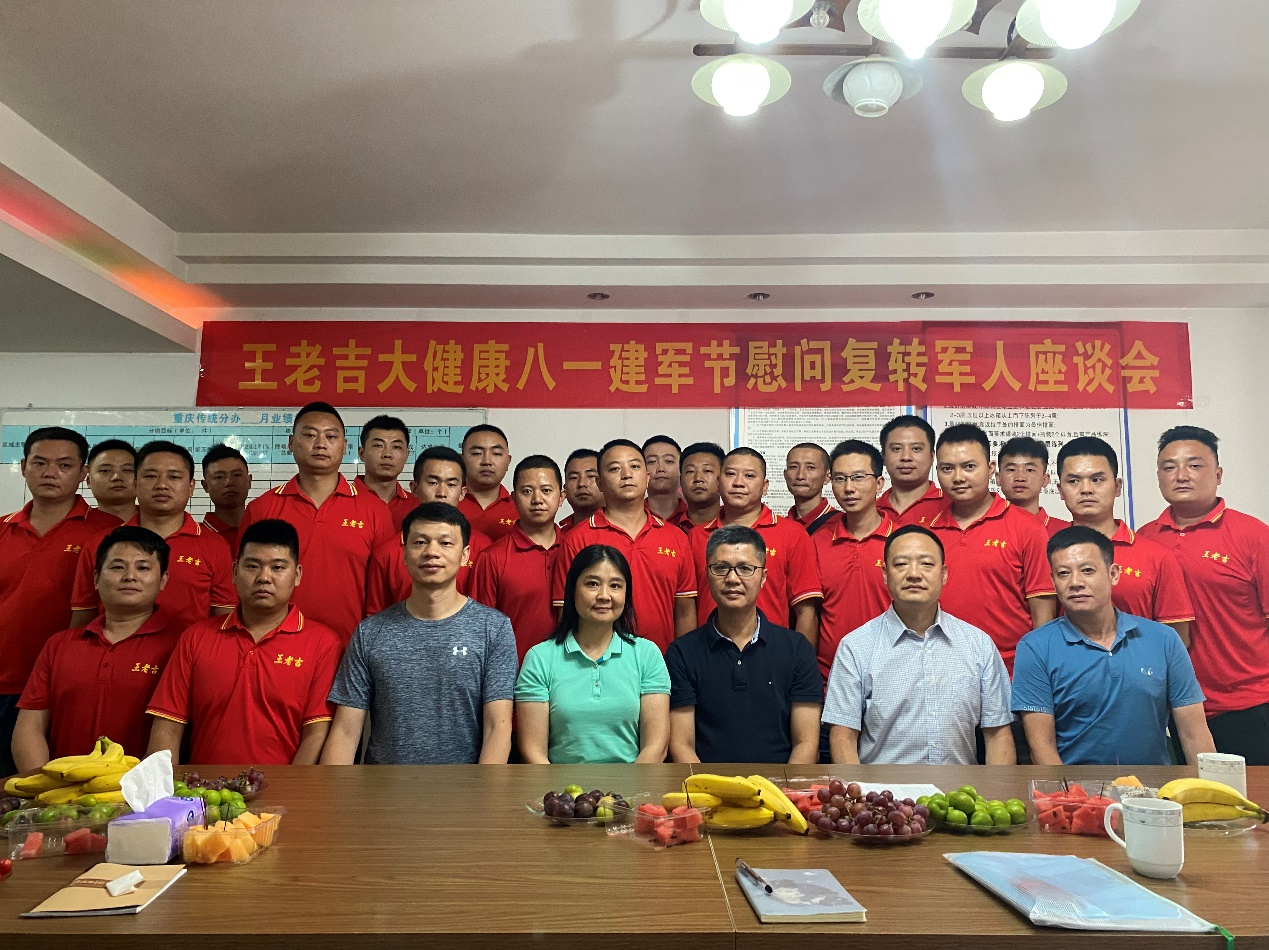 2021年是建军94周年,在八一建军节来临之际,为发扬广药集团拥军优属的光荣传统,努力营造企业改革、发展、稳定的良好氛围,广州王老吉大健康产业有限公司开展了丰富多彩的拥军优属慰问活动。7月27日下午,公司慰问团队来到销售二部川渝部,复员退伍军人代表26人参加了座谈会,公司纪委书记蔡涛、工会主席梁全心、销售二部总监王平、川渝部总监江航等出席会议,会议由安全保卫部部长乐武华主持。