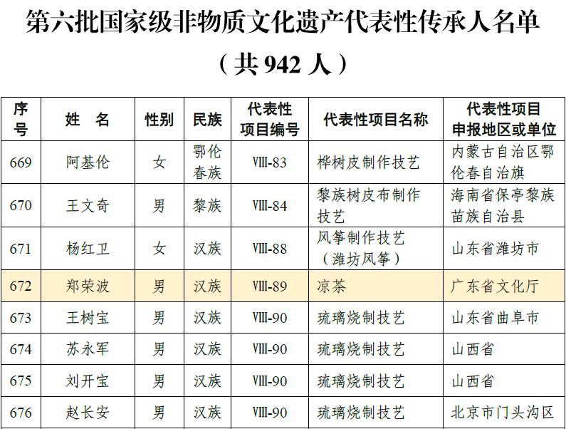 日前,国家文化和旅游部公布了第六批国家级非物质文化遗产代表性传承人名单,共计942人上榜,其中,广州王老吉大健康产业有限公司副总经理、王老吉大健康研究院院长郑荣波成功入选,被认定为国家级非物质文化遗产项目——凉茶的国家级非遗代表性传承人。