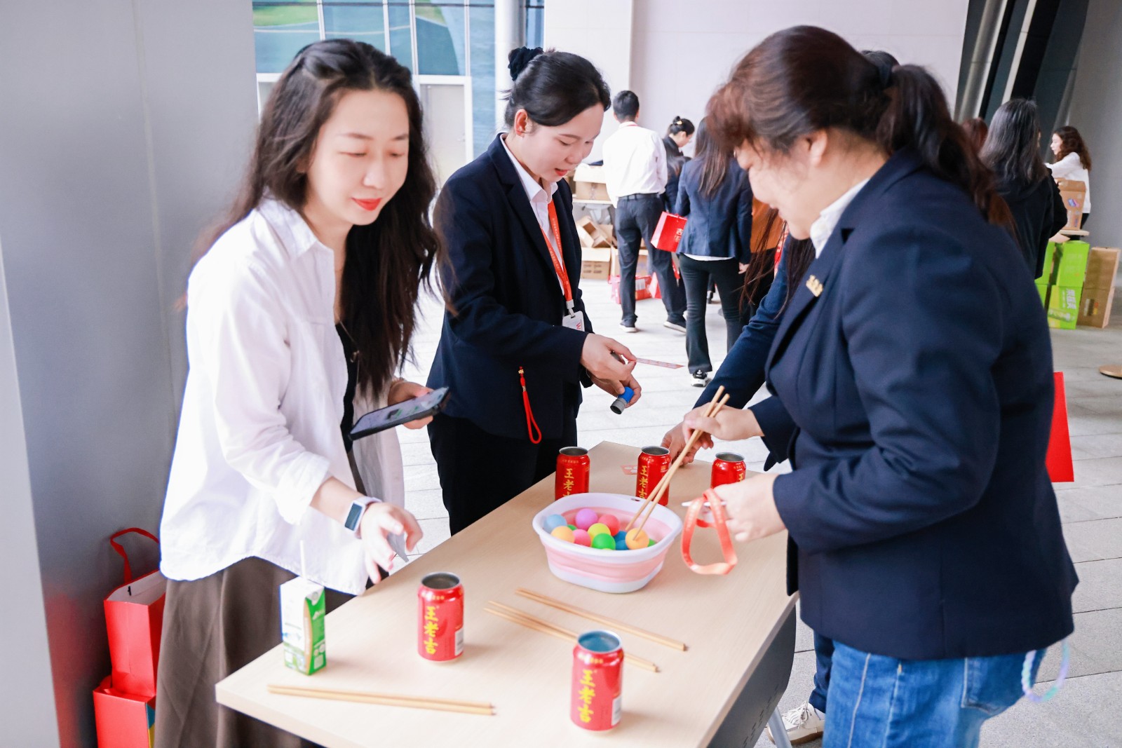 现场八大趣味游戏摊位依次排开,传统与创意交织,个人挑战与团队协作并存。投壶区里,大家屏气凝神、抬手投箭,中箭瞬间欢呼雀跃;夹福球摊位前,选手们手持长筷小心翼翼,30秒倒计时里挑战手眼协调;灯谜区围满驻足思考的员工,你一言我一语探讨谜底;套圈区更是热闹非凡,瞄准目标、挥手投掷,喝彩声不断。