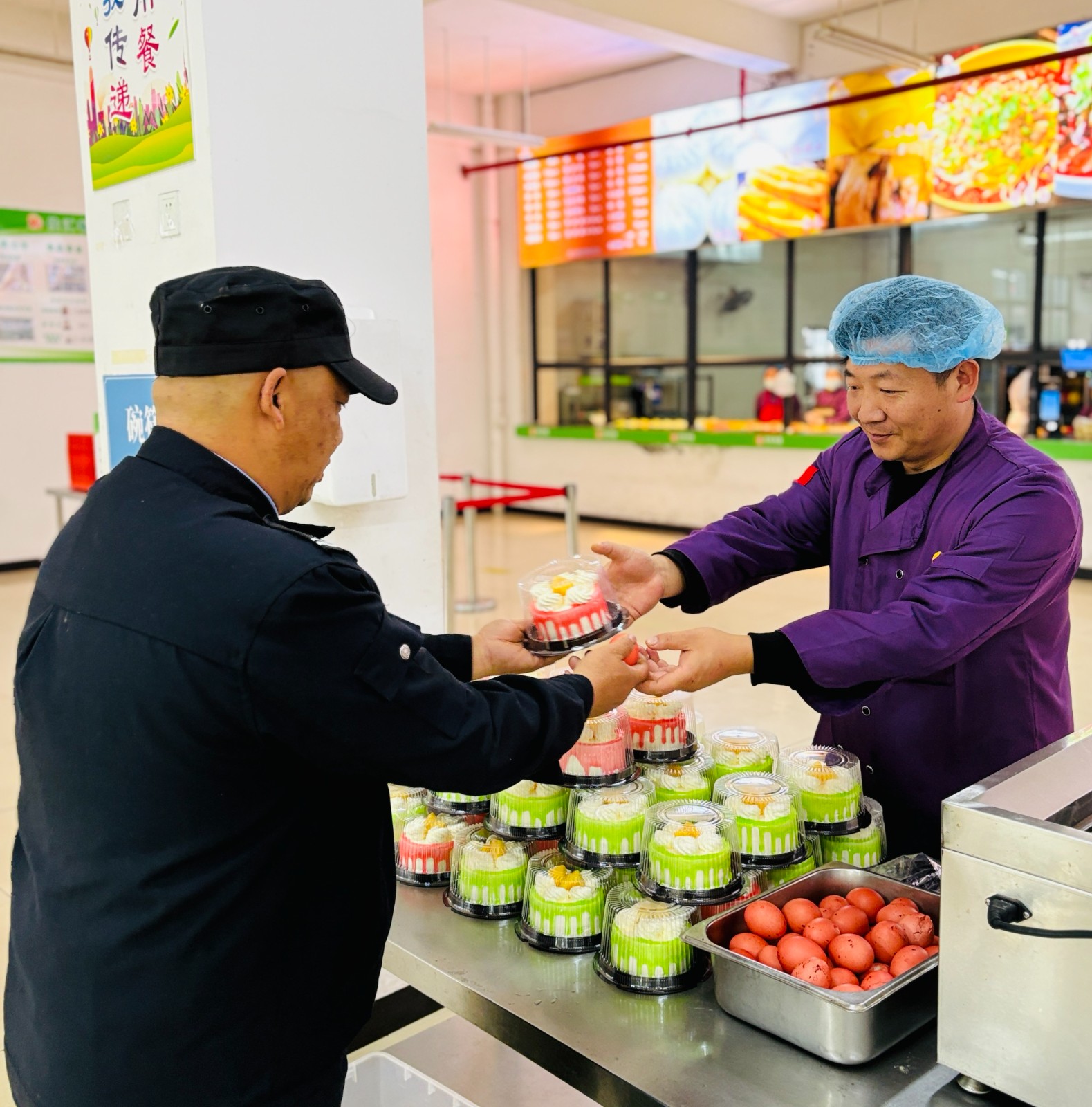 精心定制的生日蛋糕、香甜可口的小蛋糕等礼品整齐摆放,
