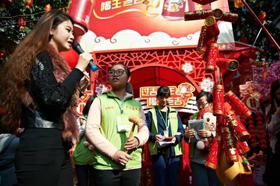 采访当天,活动主办方邀请小记者与游客们齐齐参与互动游戏环节:一起砸金蛋,抢财神派吉字袋等,体验王老吉新春“吉”庆气氛。
