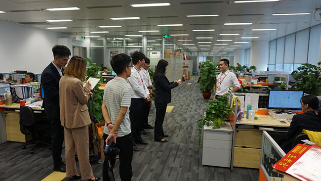 梁主席正在对生产中心同事进行消防提问