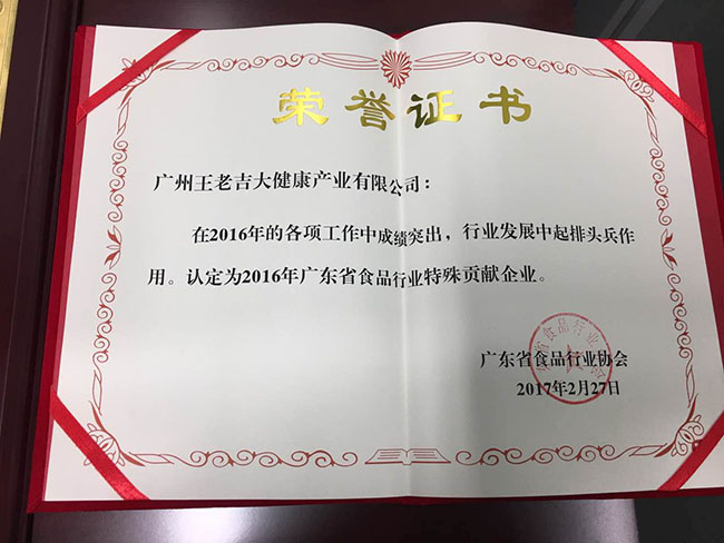 料峭春风二月起,喜讯传来王老吉。2017年2月27日,广东省食品行业协会成立35周年庆祝大会暨2016年年会在广州隆重召开。大会上,广州王老吉大健康产业有限公司因在2016年的各项工作中成绩突出,在行业发展中起排头兵作用,荣获“2016年广东省食品行业特殊贡献企业”称号,王老吉大健康公司董事长徐文流先生也荣获“2016年广东省食品行业优秀企业家”称号,双喜临门。这也是大健康公司在获得“广货全国行2013年度广东省食品行业市场开拓先进单位称号”之后再次获得的食品行业大奖。