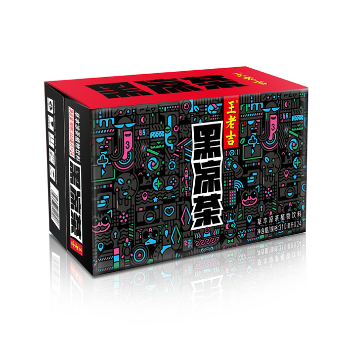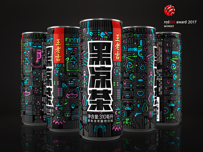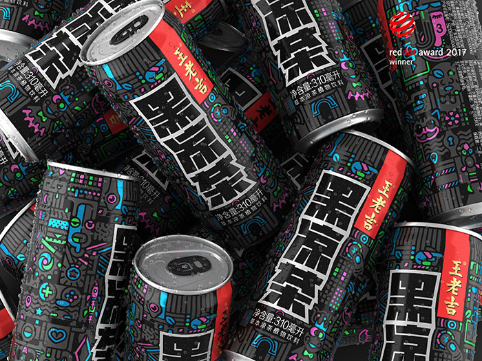 为什么是黑色?黑凉茶是一个全新的凉茶产品,除了功效和口味上的创新外,最引人注目的就是那“五彩斑斓的黑”了。“90后”极致人群大多是互联网和二次元人群,所以包装上更加追求年轻化、个性化。黑凉茶的罐身采取了黑色作为主色调,融合了88种狂热图案元素,代表88种年轻态度。黑凉茶一经面市,立刻获得众多年轻消费者的好评。值得一提的是,这款包装设计是由知名设计师潘虎设计,还斩获了设计界“奥斯卡”之称的2017德国红点奖。