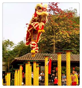 参观完祖庙,紧接着上演了一场精彩绝伦的醒狮表演——狮子走梅花桩。舞狮子的功夫小子们年龄虽小,却本领了得。脚底像装了弹簧,踩桩可谓是“快、准、稳”,跳跃时身轻如燕,踩桩的步伐孔武有力,狮子在二人默契的配合下跳跃于梅花桩之间,活灵活现,或昂首挺胸、或眨眼弄舌、甚至还调皮的摇起了尾巴。一连串大跳跃之后,狮子在最高的桩上突然立住来个180度的向下俯身旋转,那时狮子的前半身已完全悬空,惊的在场游客无不拍掌叫绝!