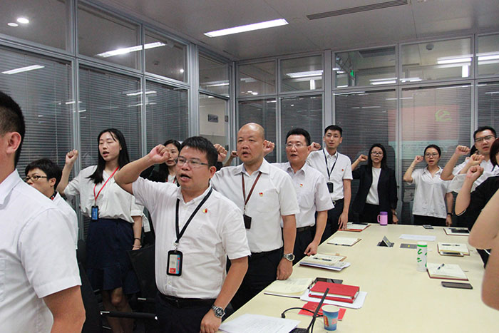 在党生日的火红7月,支部组织委员丁群生带领全体党员面向党旗,紧握拳头,郑重地重温了入党誓词。在宣誓过程中,字字誓词,都在警醒党员不要忘记党的初心,不要忘记自己入党的初心,不要忘记自己党员的身份,要时刻以一名优秀共产党员的标准要求自己、提升自己。