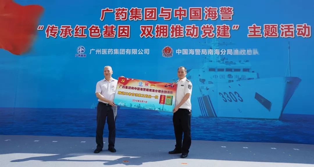 2018年8月1日,为庆祝中国人民解放军建军91周年,广药集团与中国海警局南海分局某部在广州共同开展“传承红色基因,双拥推动党建”主题活动。广药集团党委属下十个品牌党支部与海警某部十个机关、舰船党支部挂钩结对,开展双拥促建。为表达对部队官兵的关心和慰问,广药集团向海警官兵捐赠一批王老吉凉茶及常备药品。