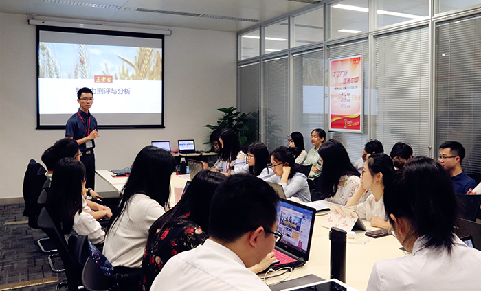 9月12日上午安排的《岗位胜任力测评与分析》就是在应届生在工作岗位上已经工作了一段时间后定制安排的课程,旨在提升他们对本工作岗位的认知并寻找自身有待提升的空间。课程由人力资源部招聘高级主管欧阳鹏进行讲解,课程讲解了胜任力模型的原理并运用测评工具,深入浅出地讲解了岗位胜任力在实际工作中的应用及如何进行测评结果分析,解决了应届生在工作中的困惑,提升了自我认知。信息部的秦德宏工程师进行了《信息安全意识》培训,通俗易懂地讲解了现代社会信息安全的重要性及如何预防信息泄露等方面的知识,提升了应届生们的信息安全意识。下午的课程根据上一期的销售知识讲解培训,进一步安排了《品牌及产品常识》培训,由公司优秀内训师王敬峰老师讲解。汪老师根据应届生的需求,精心准备课件,在讲解中列举了大量案例并与应届生现场互动,进行现场提炼演练,课程生动有趣,在寓教于乐中应届生收获了大量信息,取得了很好的学习效果。