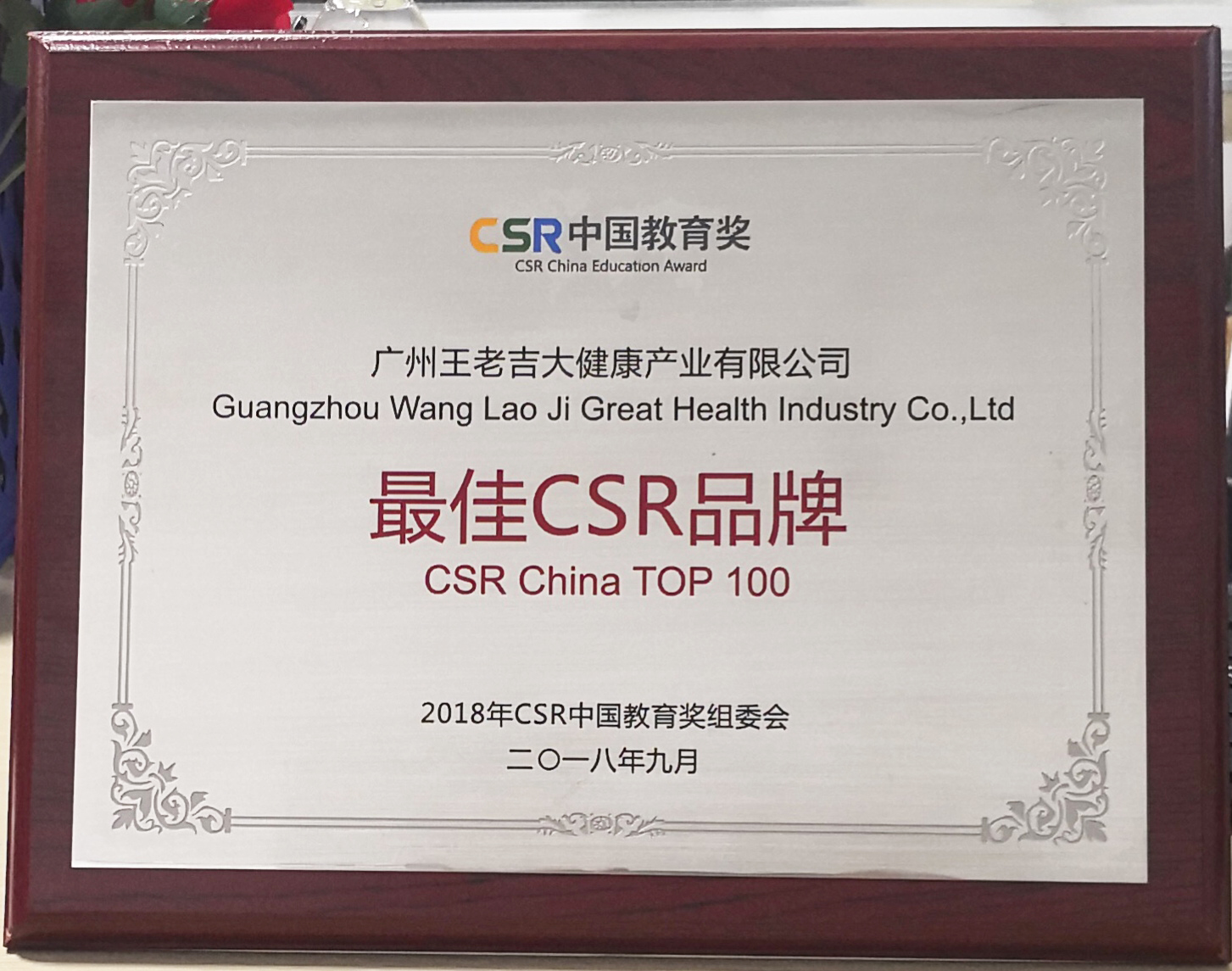 广州王老吉大健康产业有限公司荣获“最佳CSR品牌(CSR China TOP 100)”奖项