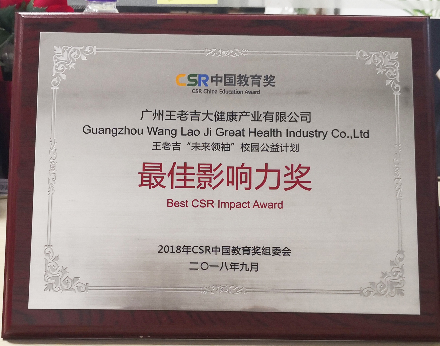 经过专家评委的评选,广州王老吉大健康产业有限公司荣获“最佳CSR品牌(CSR China TOP 100)”奖项,王老吉“未来领袖”校园公益计划项目荣获“最佳影响力奖(Best CSR Impact Award)”。
