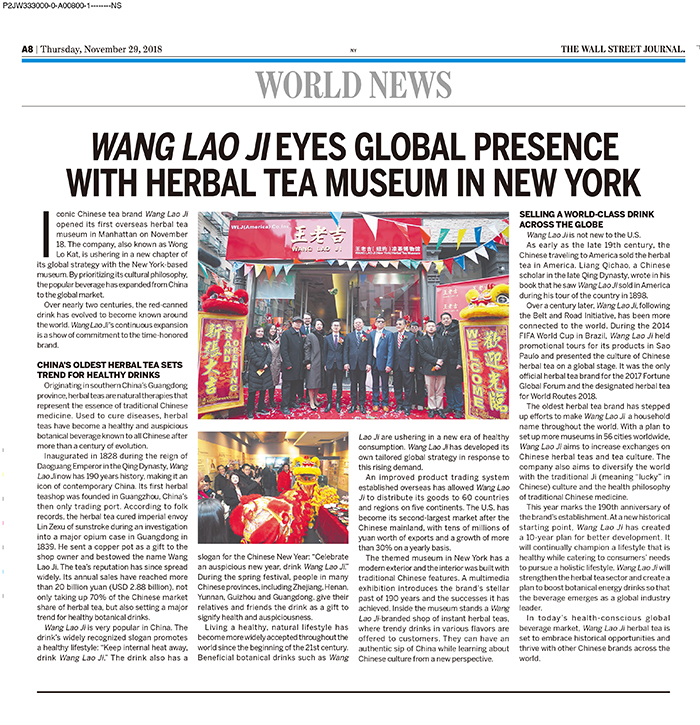 近日,在王老吉品牌190年之际,首个海外凉茶博物馆在纽约曼哈顿格兰街开馆,吸引了当地市民和外媒的广泛关注。美东时间11月29日,权威外媒《华尔街日报》以《王老吉:坐标纽约再出发 打造世界级饮料》(Wang Lao Ji eyes global presence with herbal tea museum in New York)为题,对王老吉的历史和国际化战略进行了深度解读。