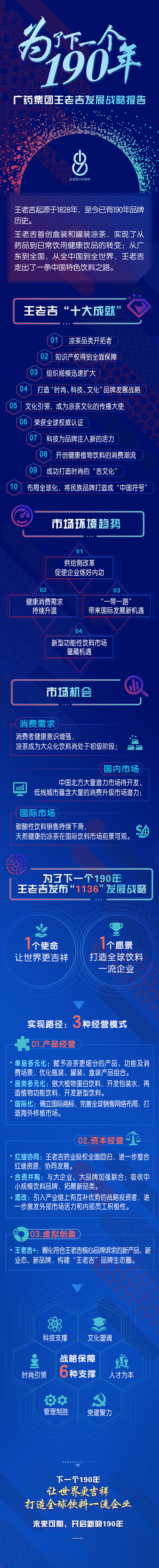 11月29日,广药集团王老吉190周年创新发展大会在广州举办,王老吉提出了“下一个190年”战略目标——打造全球饮料一流企业,让世界更吉祥。 在“下一个190年”战略目标指导下,大会发布了王老吉“1136”发展战略。欲知战略详情,请看下图分解