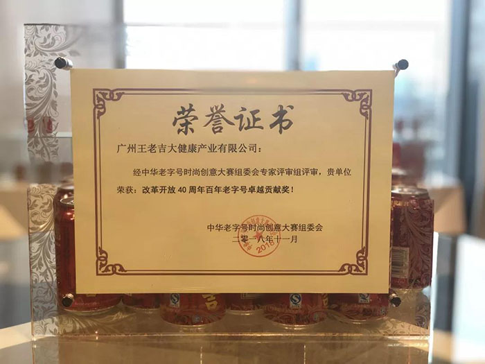 老字号承载着中国传统文化的精髓,是民族文化的历史积淀。改革开放四十年间,有着190周年历史的王老吉在经历市场竞争大潮生存和发展的的同时,也不断发扬自己独有的传承和创新精神,成为老字号企业的杰出代表,获得了组委会特别颁发“改革开放40周年百年老字号卓越贡献奖”。
