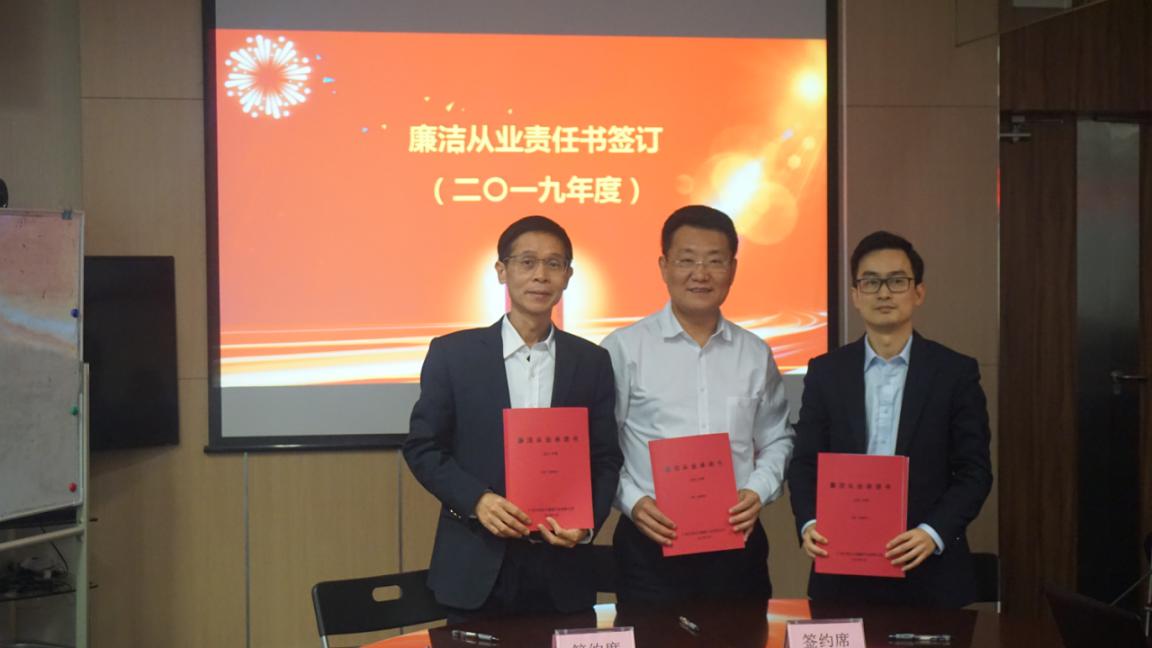 纪委书记米琪同志与投资基建中心分管领导郑荣波同志,市场部、公共事务部分管领导叶继曾同志签订了2019年度廉洁从业承诺书