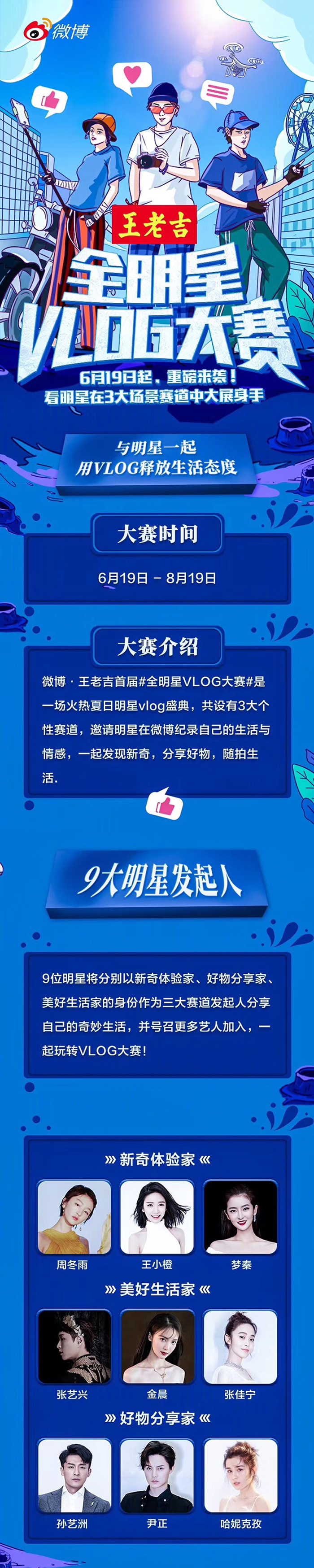 张艺兴、周冬雨、金晨、尹正等9大明星将轮番接力参与王老吉·微博首届全明星Vlog大赛,以“发现”、“分享”、“生活”3个方向,发布定制Vlog,在展现个人生活态度的同时软性输出王老吉的品牌理念,以此助力王老吉提升品牌好感度,开拓更丰富的凉茶消费场景,打造一个“品牌+平台+明星+用户”的内容生态圈。