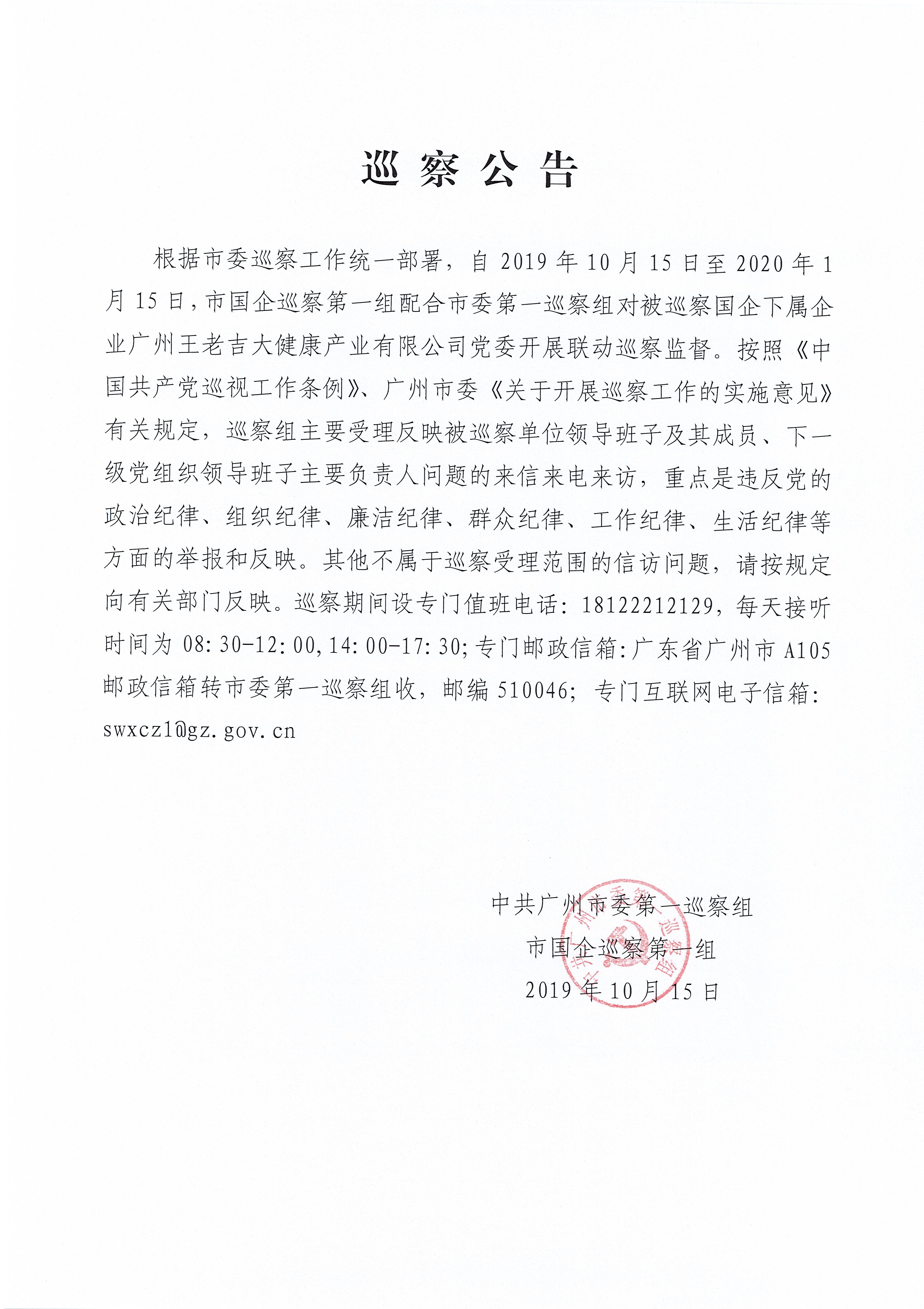 根据市委巡察工作统一部署,自2019年10月15日至2020年1月15日,市国企巡察第一组配合市委第一巡察组对被巡察国企下属企业广州王老吉大健康产业有限公司党委开展联动巡察监督。按照《中国共产党巡视工作条例》、广州市委《关于开展巡察工作的实施意见》有关规定,巡察组主要受理反映被巡察单位领导班子及其成员、下一级党组织领导班子主要负责人问题的来信来电来访,重点是违反党的政治纪律、组织纪律、廉洁纪律、群众纪律、工作纪律、生活纪律等方面的举报和反映。其他不属于巡察受理范围的信访问题,请按规定向有关部门反映。巡察期间设专门值班电话:18122212129,每天接听时间为08:30-12:00,14:00-17:30;专门邮政信箱:广东省广州市A105邮政信箱转市委第一巡察组收,邮编510046;专门互联网电子信箱:swxcz1@gz.gov.cn