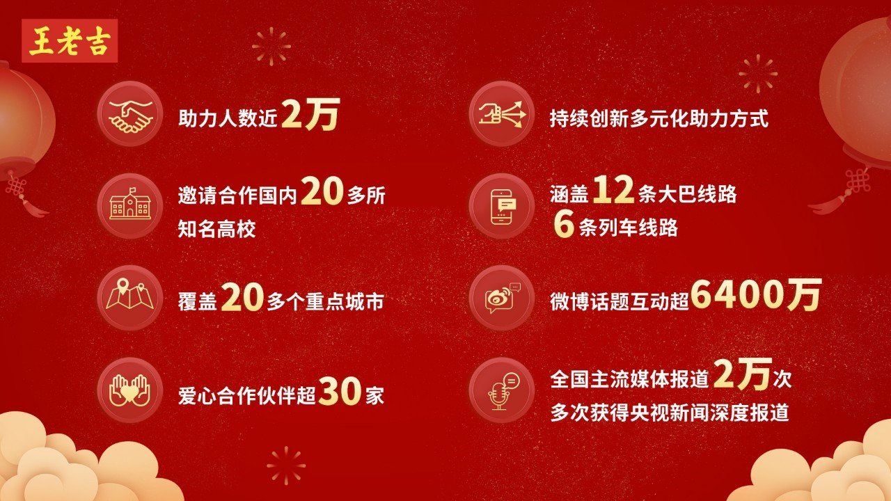 七年里,王老吉“让爱吉时回家”春运关爱行动覆盖全国20多个重点城市,邀请20多所高校师生参与招募计划,与30多家政府机构、媒体、企业结成公益联盟,共帮扶近2万有需要的人士顺利返乡团圆;同时持续创新和丰富多元化的助力方式,获得全国各大主流媒体报道达2万余篇次,多次获得央视新闻深度报道。
