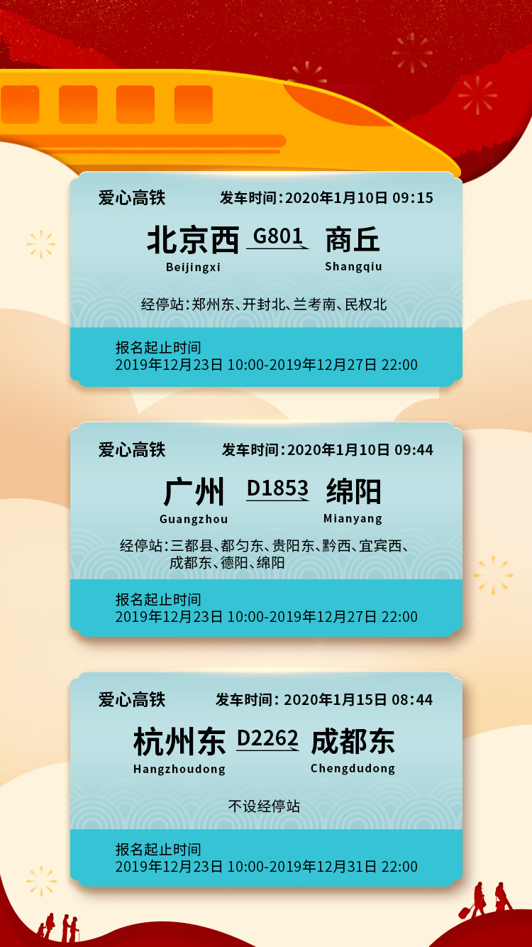为帮助有需要的人士实现返乡与亲人团圆的梦想,共建美好春运,王老吉联合广铁集团、上铁集团、南方日报、今日头条、封面新闻、江南游报、同程艺龙等爱心单位,共同发起的三条爱心高铁,于2019年12月23日起正式向公众开放,接受报名。