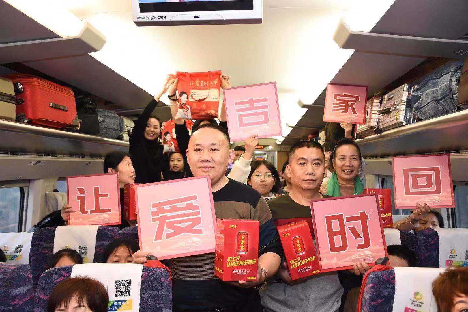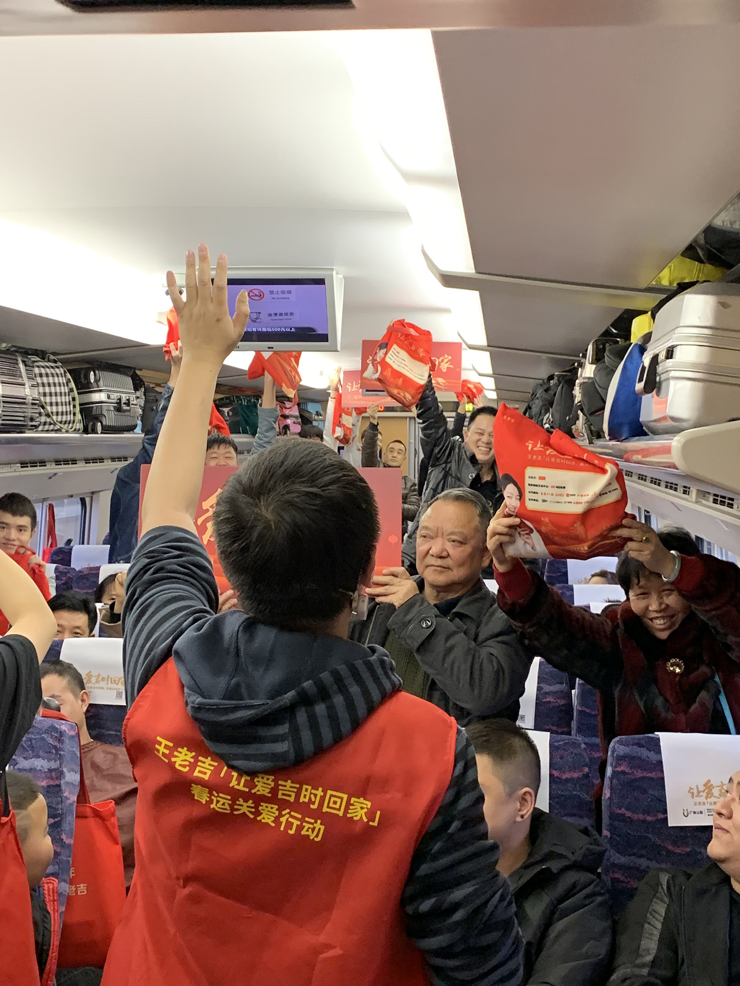 发车仪式结束后,846名返乡劳动者秩序井然地步入候车大厅,踏上“让爱吉时回家”精心布置过的爱心高铁。看着被装点一新的车厢,贴满喜庆窗花的窗户,摆着爱心礼包的桌子,他们个个笑逐颜开、心情舒畅。不仅如此,为了让大家度过一个愉快的回家之旅,我们还准备了唱歌、飞花令等互动娱乐项目,大家互动热情高涨,车厢内充满欢声笑语。