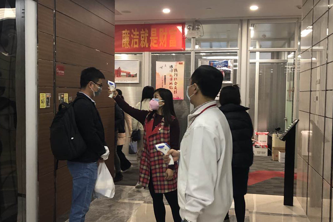 而各个岗位上的同事也在应对这一场狙击战而付出自己的努力。为了保障大家办公环境卫生安全,本部公司办公室的同事在节前就开始准备足够的消毒水,以便对场地进行消毒;为了进行安全排查,公司人力资源部的同事每天都会提前一个小时到岗,对总部上班的员工进行体温检测;为了保证上班职工上班的安全,工会同事全力协调口罩的供应……
