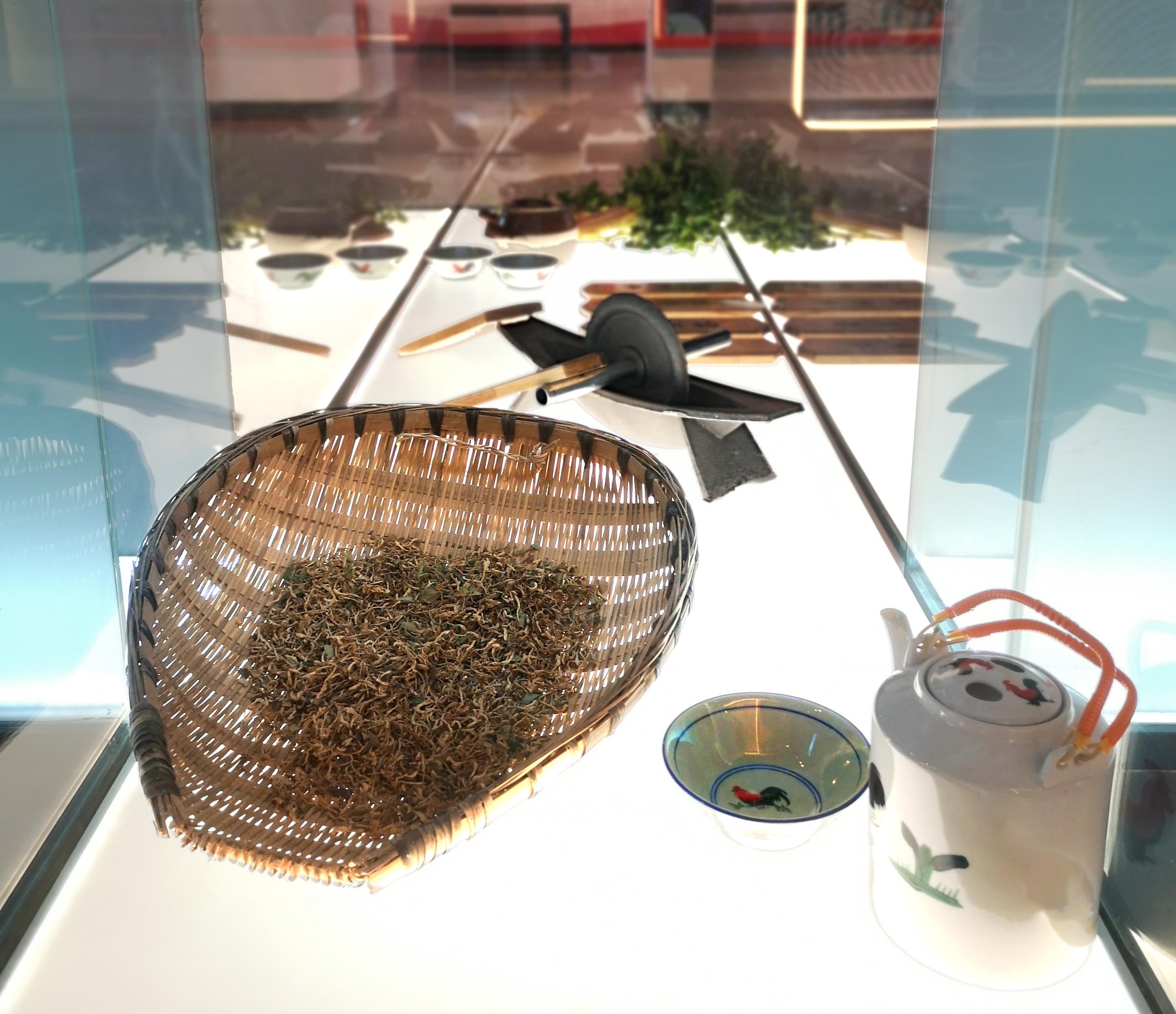 图:盛有金银花等原料的簸箕、传统鸡公碗、茶煲、碾药船等展品