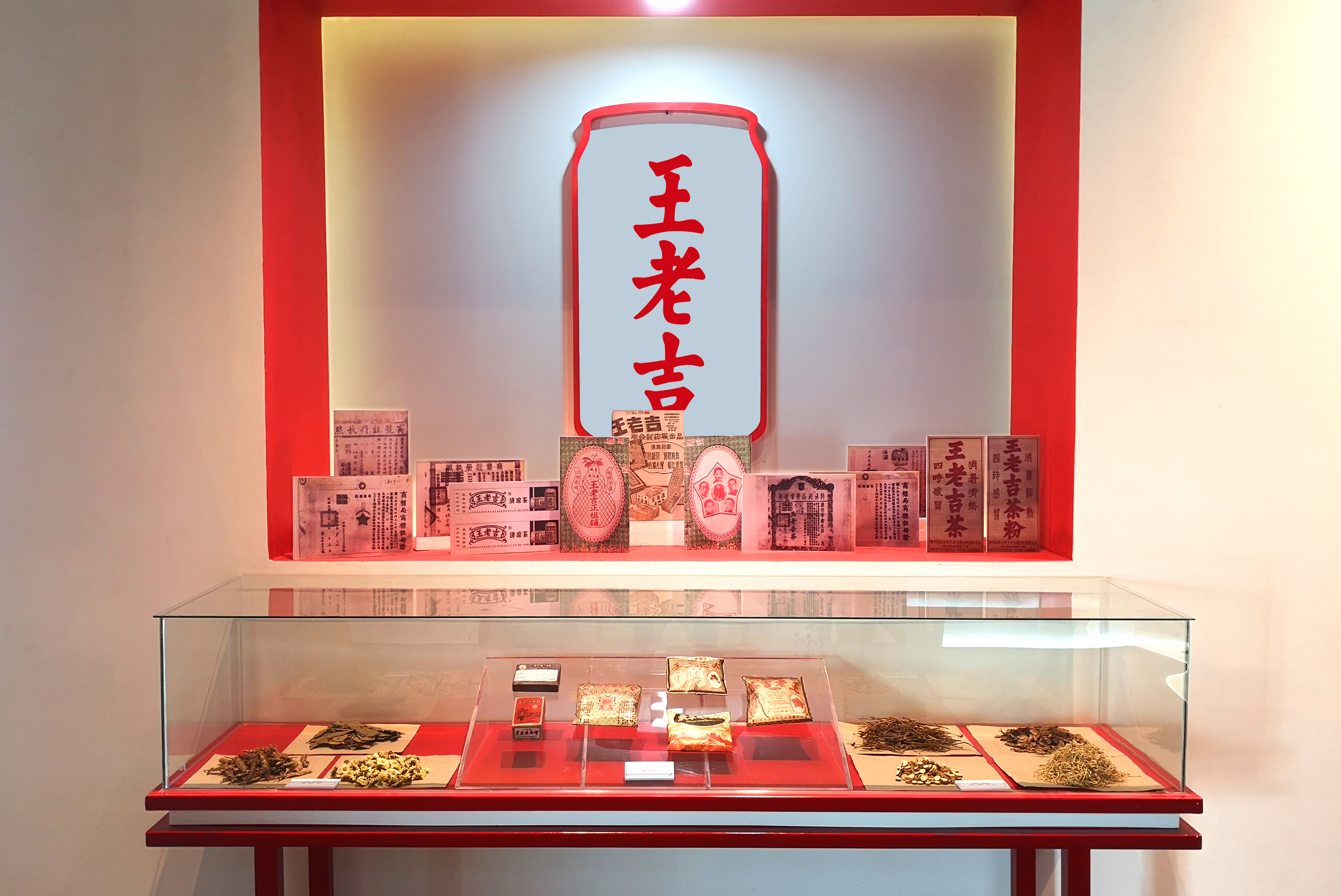 图:展示了王老吉凉茶“三花三草一叶”的七种原料、历代王老吉凉茶的包装、历史商品海报等
